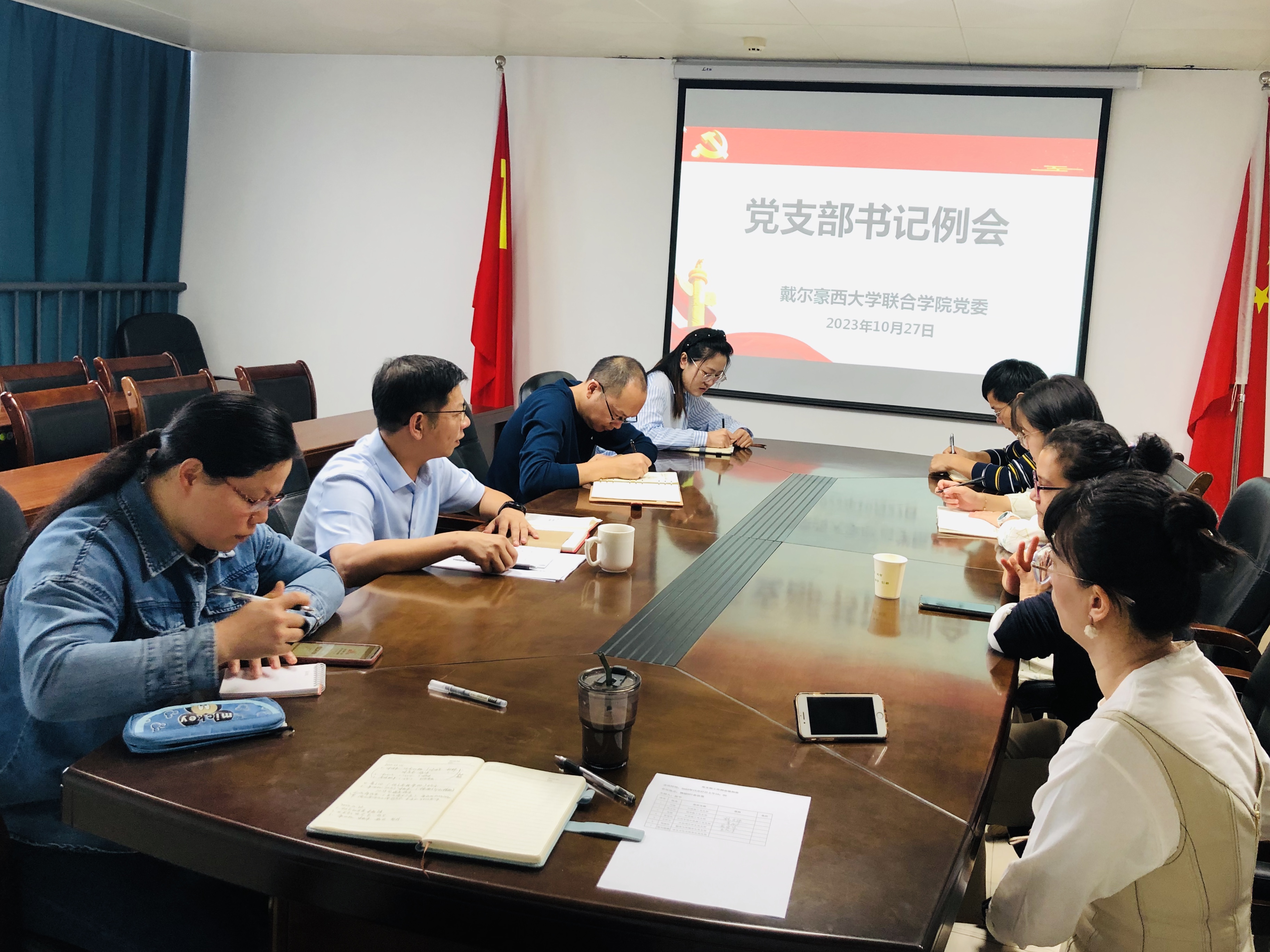 10月27日上午,戴尔豪西大学联合学院党委在旗综901会议室召开党支部书记例会,院党委书记林平、副书记刘敏、师生党支部书记及组织员参会,林平主持会议。