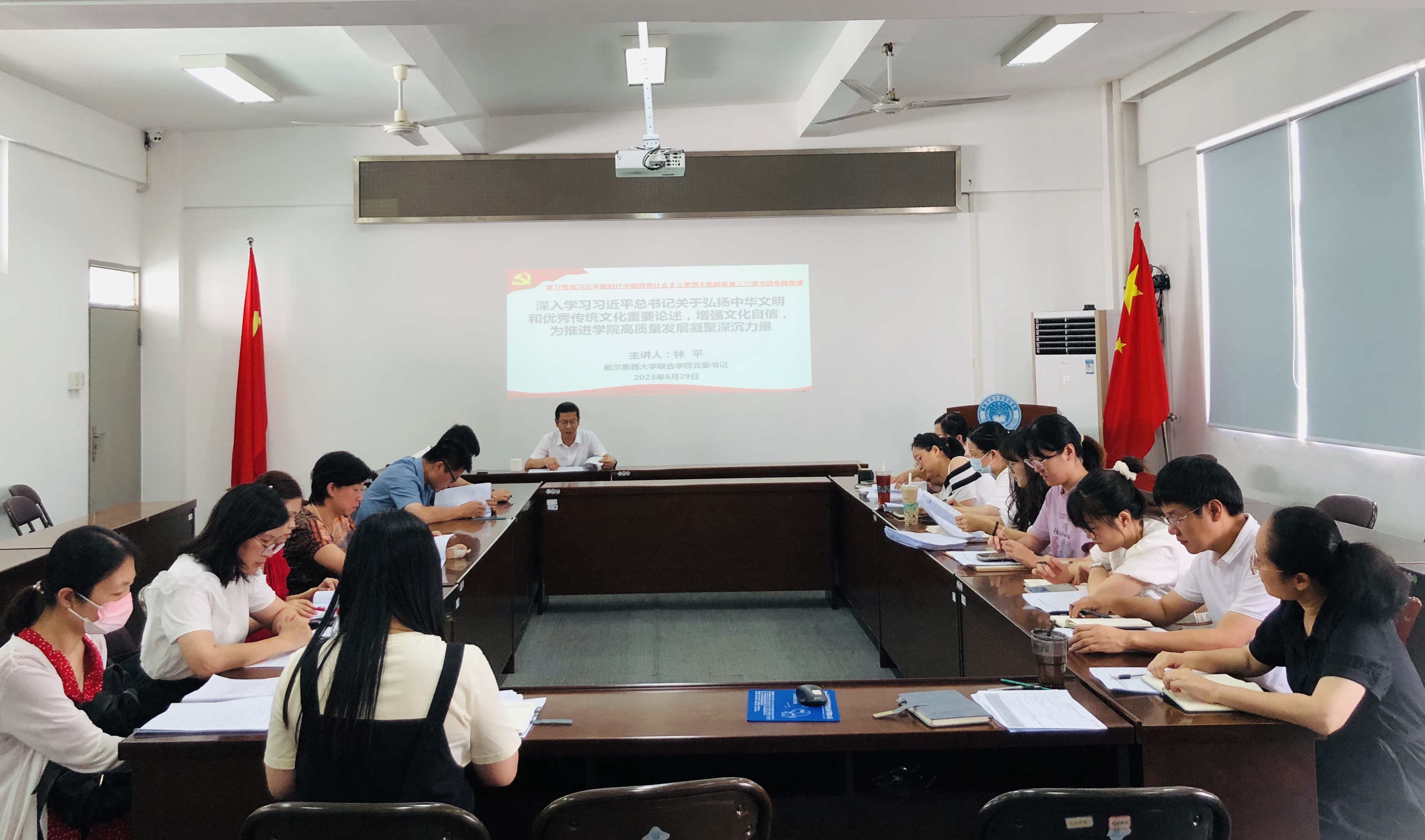 林平强调,一要深刻学习领会习近平总书记关于弘扬中华文明和优秀传统文化的重要论述精神,紧密结合人文社科类教育教学实际、充分发挥语言与文化传播优势,进一步凝练打造学院文化理念,凝聚全体师生助力国家文化软实力提升的磅礴力量;二要坚持马克思主义的根本指导思想,吸收中华优秀传统文化中的思想精华,用中国特色社会主义文化培根铸魂,围绕立德树人根本任务,引领广大青年学生积极践行社会主义核心价值观;三要坚定文化自信,立足英语专业、国学“雅言经典”以及来华留学生“一带一路”福文化研习社等载体与平台,推动中华优秀传统文化创造性转化、创新性发展,进一步提升讲好中国故事、传播好中国声音的能力,在世界舞台上积极展现中国形象。