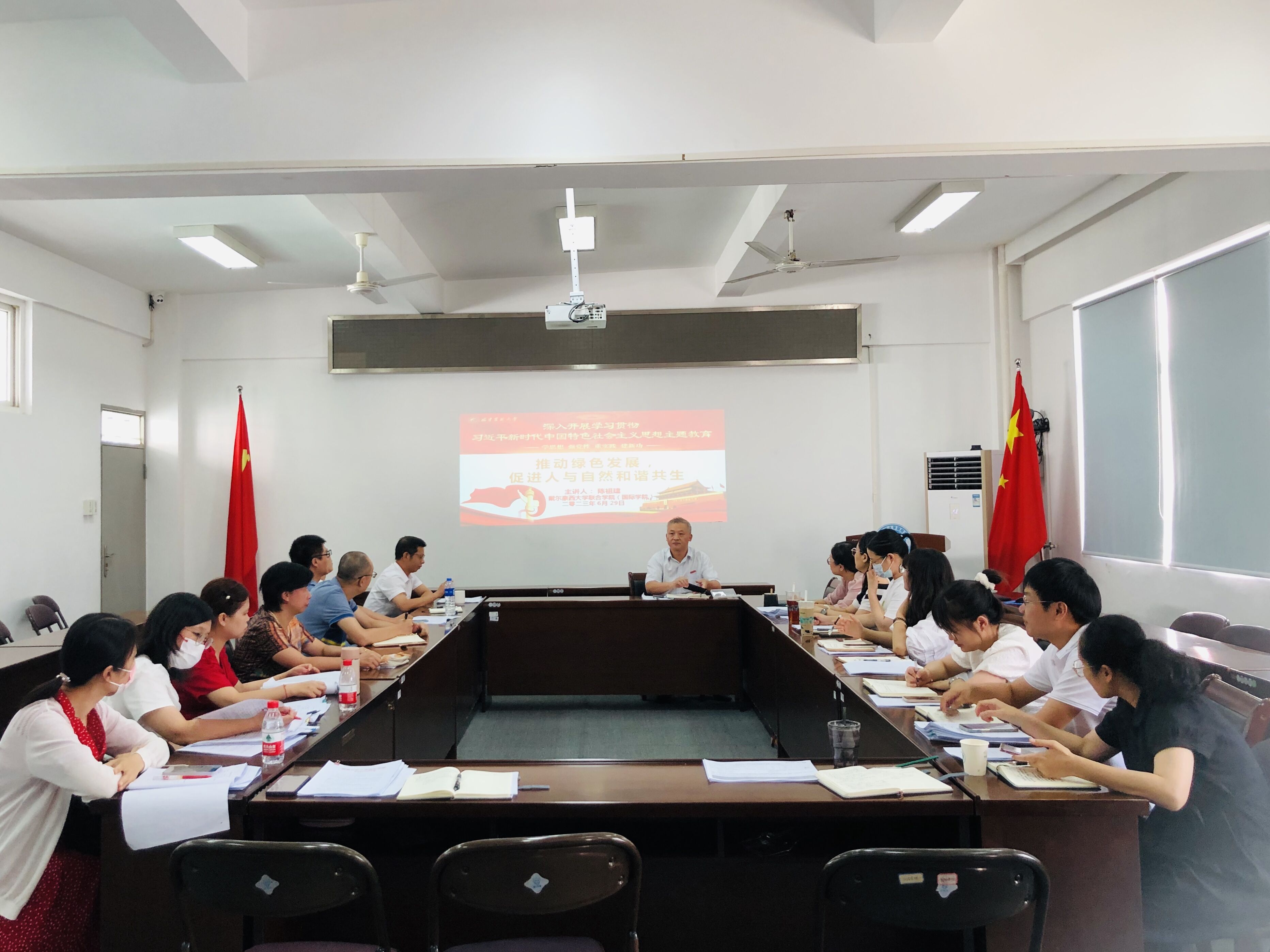 6月29日,戴尔豪西大学联合学院(国际学院)院长在明北附303会议室作了题为《推动绿色发展,促进人与自然和谐共生》的主题教育第三次读书班专题党课。党政领导班子成员、科室负责人、系部负责人、党支部书记、全体辅导员到场学习聆听。