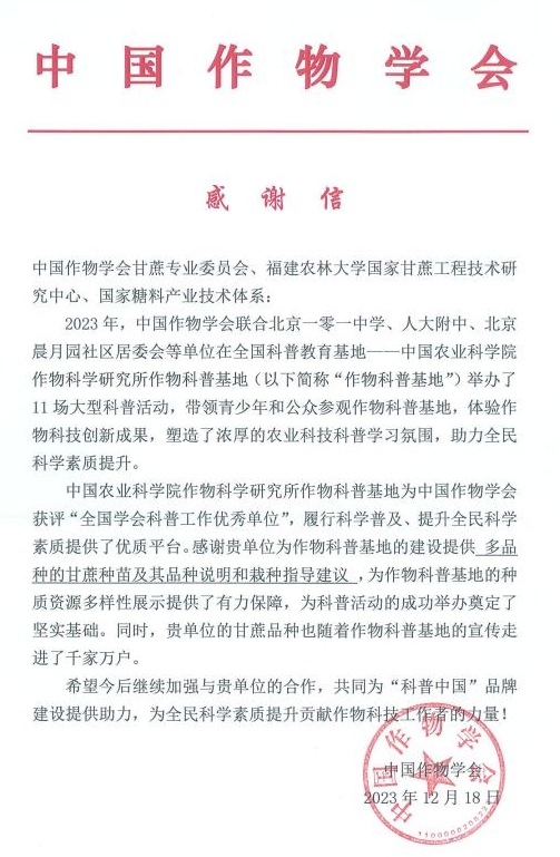 近日,中国作物学会向依托我校的甘蔗专业委员会、国家甘蔗工程技术研究中心等单位发来感谢信。这是中国作物学会第四年来信,感谢我校有关单位为作物科普基地的建设提供多品种的甘蔗种苗及其品种说明和栽种指导建议,为作物科普基地的种质资源多样性展示提供了有力保障,为科普活动的成功举办奠定了坚实基础。同时,甘蔗科普知识的宣传也走进了千家万户。