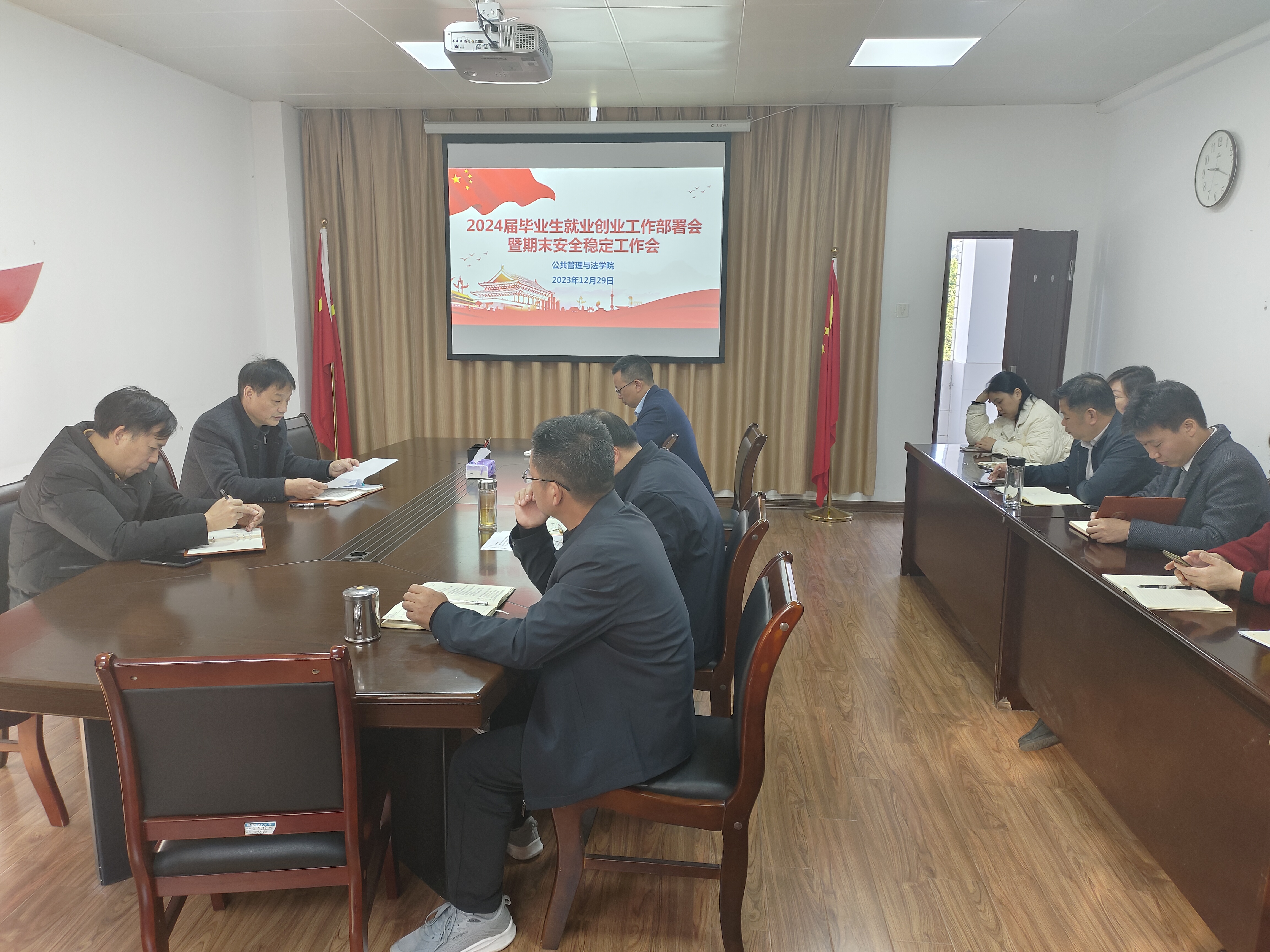12月29日上午,公共管理与法学院在学院办公楼416会议室召开2024届毕业生就业创业工作部署会暨期末安全稳定工作会,学院领导班子成员、科级干部、各系主任和辅导员参加会议。会议由学院党委书记曾起郁主持。
