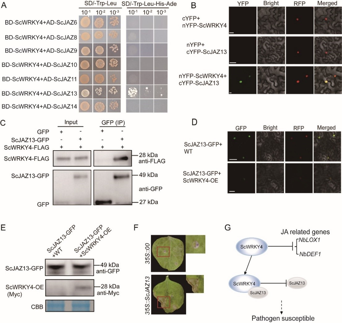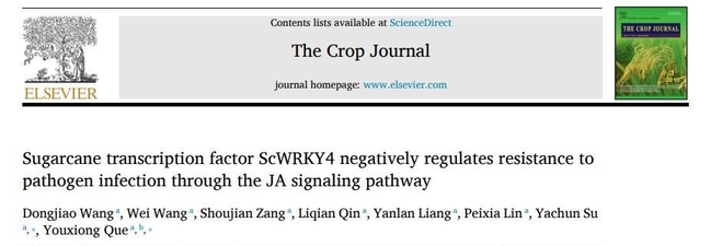 (1)在The Crop Journal(《作物学报》英文版)发表了题为Sugarcane transcription factorScWRKY4 negatively regulates resistance to pathogen infection through the JA signaling pathway(甘蔗ScWRKY4通过JA信号通路调控植物抗病性)的研究论文,揭示了甘蔗转录因子ScWRKY4负调控植物对病原菌的防御反应,并深入探究ScWRKY4可能通过结合ScJAZ13蛋白并抑制其表达,通过JA信号通路参与植物抗病性的调控网路,进而调节植物对病原菌抗性的分子机制。本研究为进一步探究ScWRKY4在甘蔗中的抗病作用机制奠定了基础。开云网页版为第一单位,我校在读博士研究生王东姣为该论文的第一作者,苏亚春副研究员和阙友雄研究员为该论文的共同通讯作者。