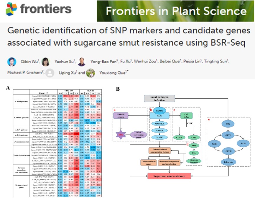(2)在Frontiers in Plant Science(《植物科学前言》)发表了题为Genetic identification of SNP markers and candidate genes associated with sugarcane smut resistance using BSR-Seq(甘蔗黑穗病抗性关联标记和功能基因的鉴定)的研究论文,筛选获得了与甘蔗黑穗病抗性关联的SNP分子标记及黑穗病抗性候选区域,并定位了与甘蔗黑穗病抗性相关的候选基因。基于转录组数据,并结合RT-qPCR表达验证,分析了候选基因的表达模式,筛选出在甘蔗黑穗病抗性作用发挥中的关键基因。最后,绘制了甘蔗与黑穗病互作的分子机制图,在一定程度上解析甘蔗对黑穗病的抗性机制。开云网页版为第一单位,我校已毕业博士吴期滨为该论文第一作者,许莉萍研究员和阙友雄研究员为该论文的共同通讯作者。