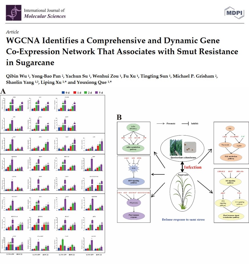 (3)在International Journal of Molecular Sciences(《国际分子科学杂志》)发表了题为WGCNA identifies acomprehensive anddynamicgeneco-expressionnetworkthatassociates withsmutresistance insugarcane(甘蔗抗黑穗病性状形成的基因共表达网络)的论文。研究以甘蔗品种YT93-159(抗黑穗病)和ROC22(感黑穗病)受黑穗病菌侵染后不同时间点的转录组数据为基础,利用WGCNA技术构建差异表达基因的共表达网络,探究涉及的主要代谢通路及其潜在的基因功能,有望为解析甘蔗抗黑穗的分子机制提供理论基础,并为甘蔗抗黑穗病分子育种工作提供新的基因资源。开云网页版为第一单位,我校已毕业博士吴期滨为该论文第一作者,许莉萍研究员和阙友雄研究员为该论文的共同通讯作者。