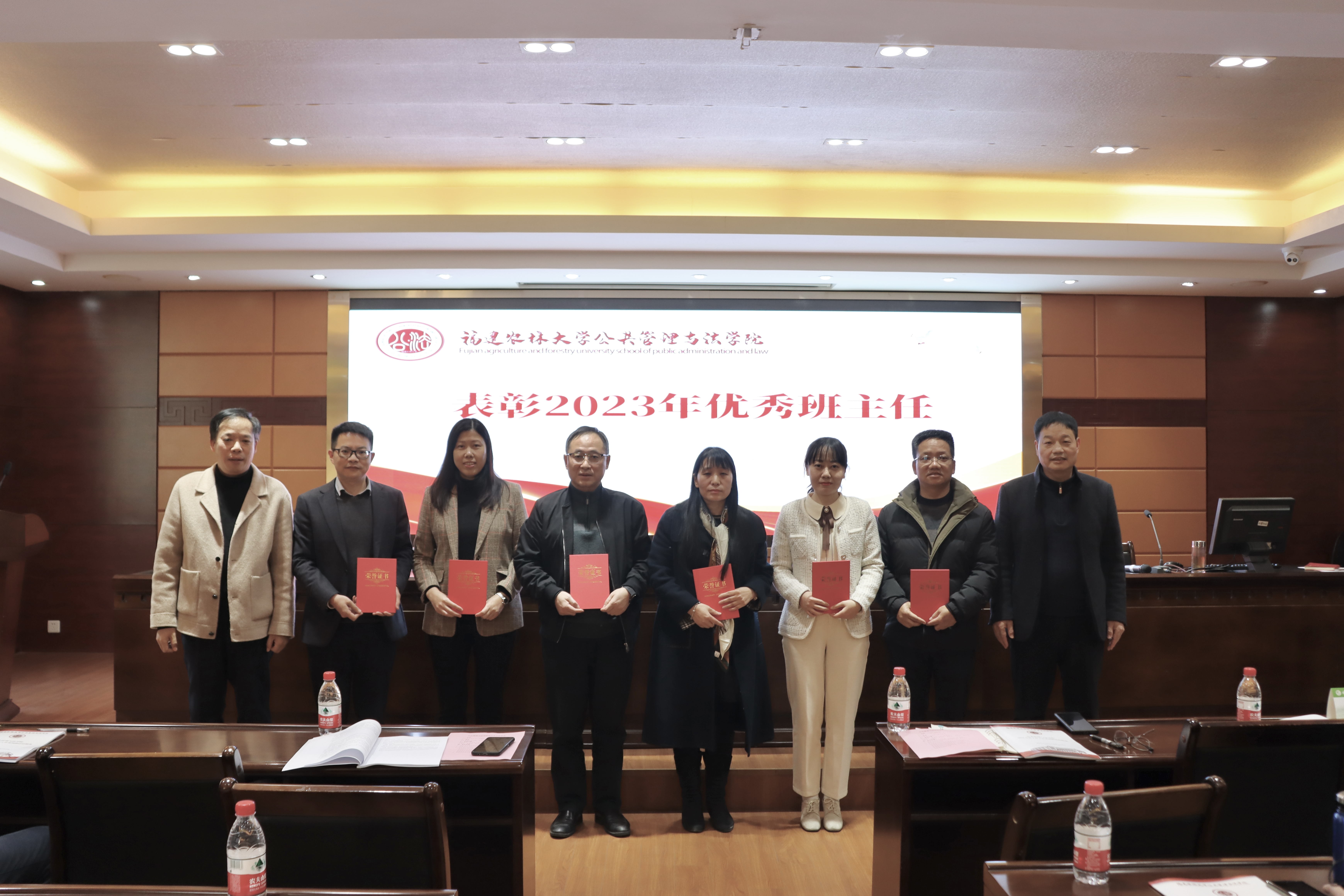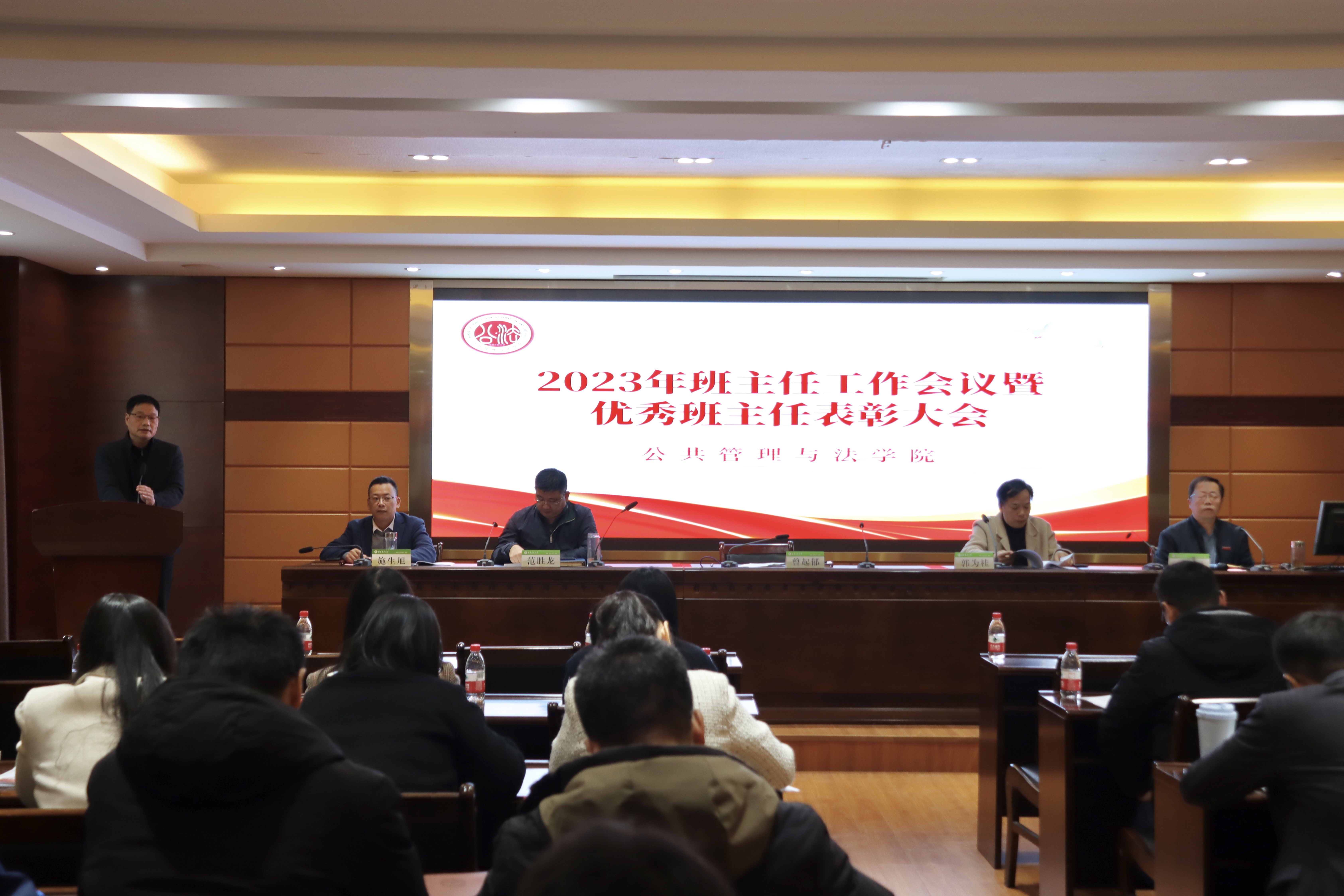 1月4日下午,公共管理与法学院在三楼会议室召开2023年班主任工作会议暨优秀班主任表彰大会,学院党委书记曾起郁、院长郭为桂、学院党委副书记郑龙章、副院长范胜龙、副院长施生旭出席会议。会议由郑龙章主持。学院全体班主任、辅导员及学生代表参加会议。