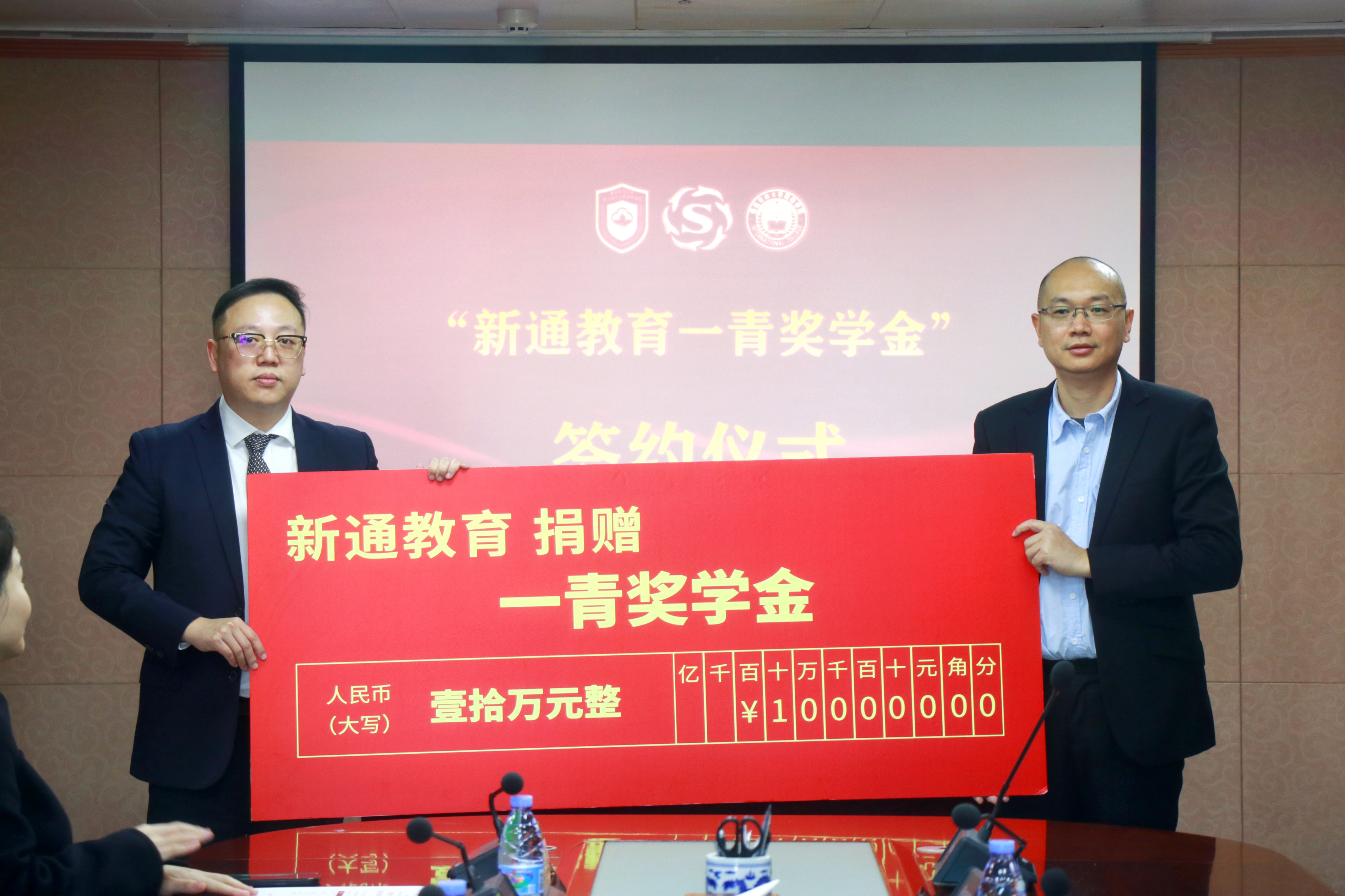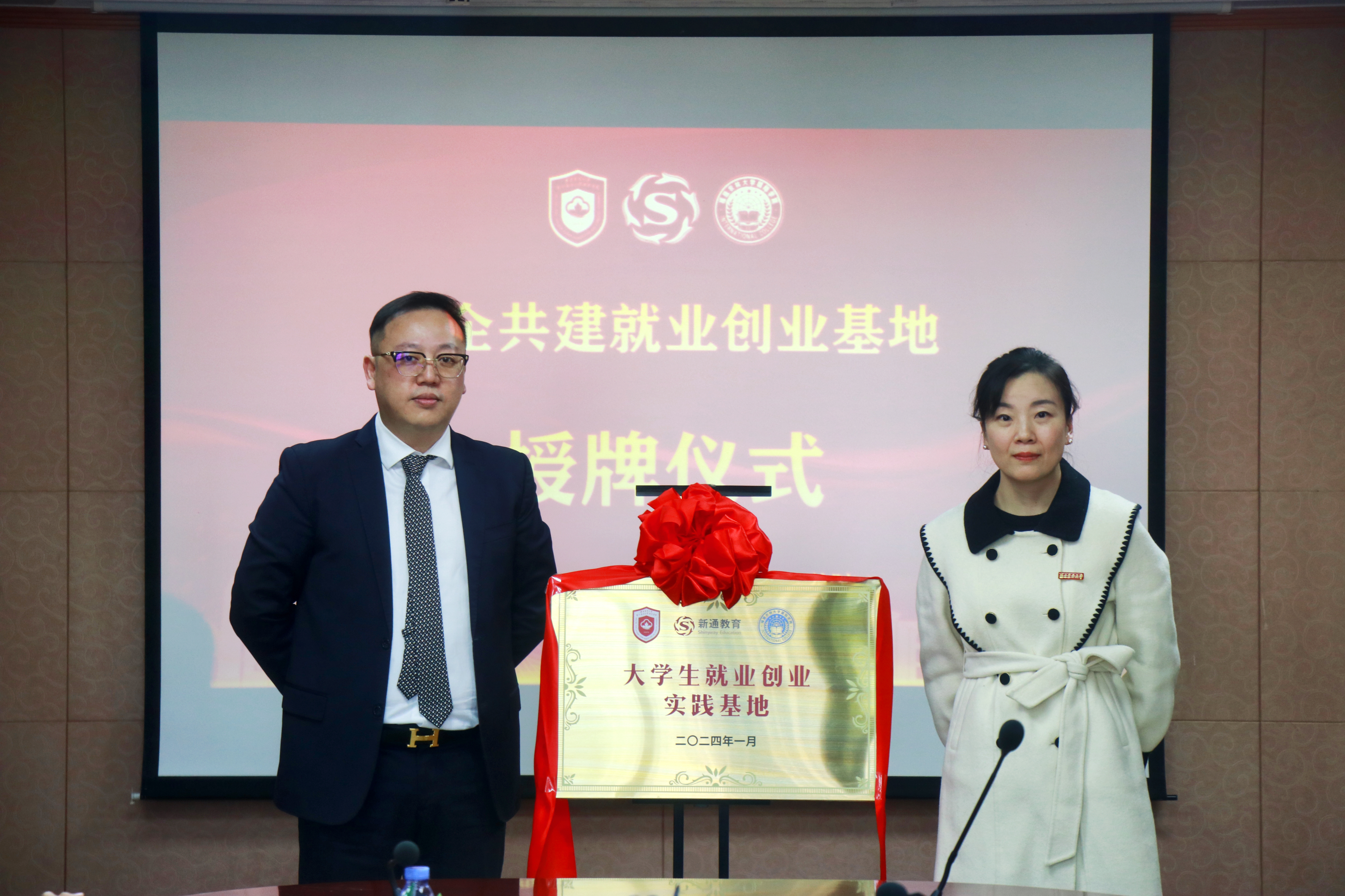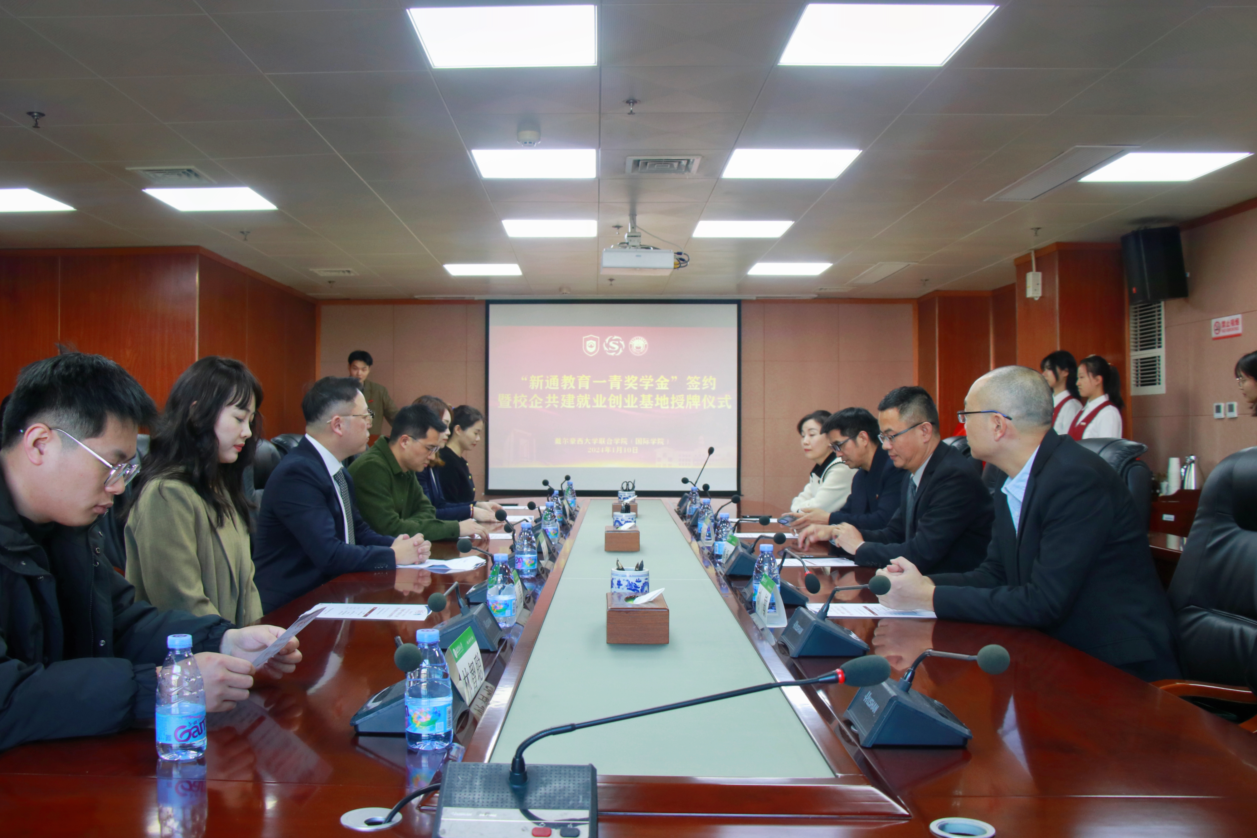 陈冰致辞,介绍了“一青”奖学金和其英文名“All for young”的含义,即“一心为青年”,表达对母校的感恩和厚意,表示愿以此奖学金为契机,助力学校国际化人才培养。随后,新通教育集团捐资十万元设立学院“一青”奖学金,用于资助在毕业升学和国际交流中表现优异的中外学生。学院向新通教育集团授予校企共建就业创业基地牌匾,双方达成共识,未来将共同搭建助力青年学子快速成长平台,共同助力教育事业长足发展。