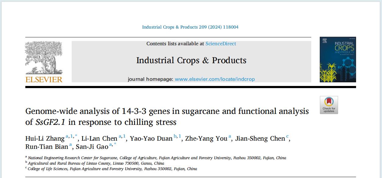 甘蔗是全球第五大宗农作物,甘蔗糖分别占全球和中国食糖总产量80%和87%,保障我国食糖供给安全是国家战略需求。我国蔗区常遭受病虫、干旱、低温等生物和非生物胁迫的危害,严重威胁甘蔗产业的健康可持续发展,其中冷害是甘蔗生产中常见的自然灾害。最近,我校国家甘蔗工程技术研究中心病虫害绿色防控研究室高三基/张慧丽团队在中科院一区TOP期刊Industrial Crops and Products(《工业作物与产品》)发表基于全基因组解析甘蔗14-3-3基因及SsGF2.1应答低温胁迫的分子功能的学术论文。