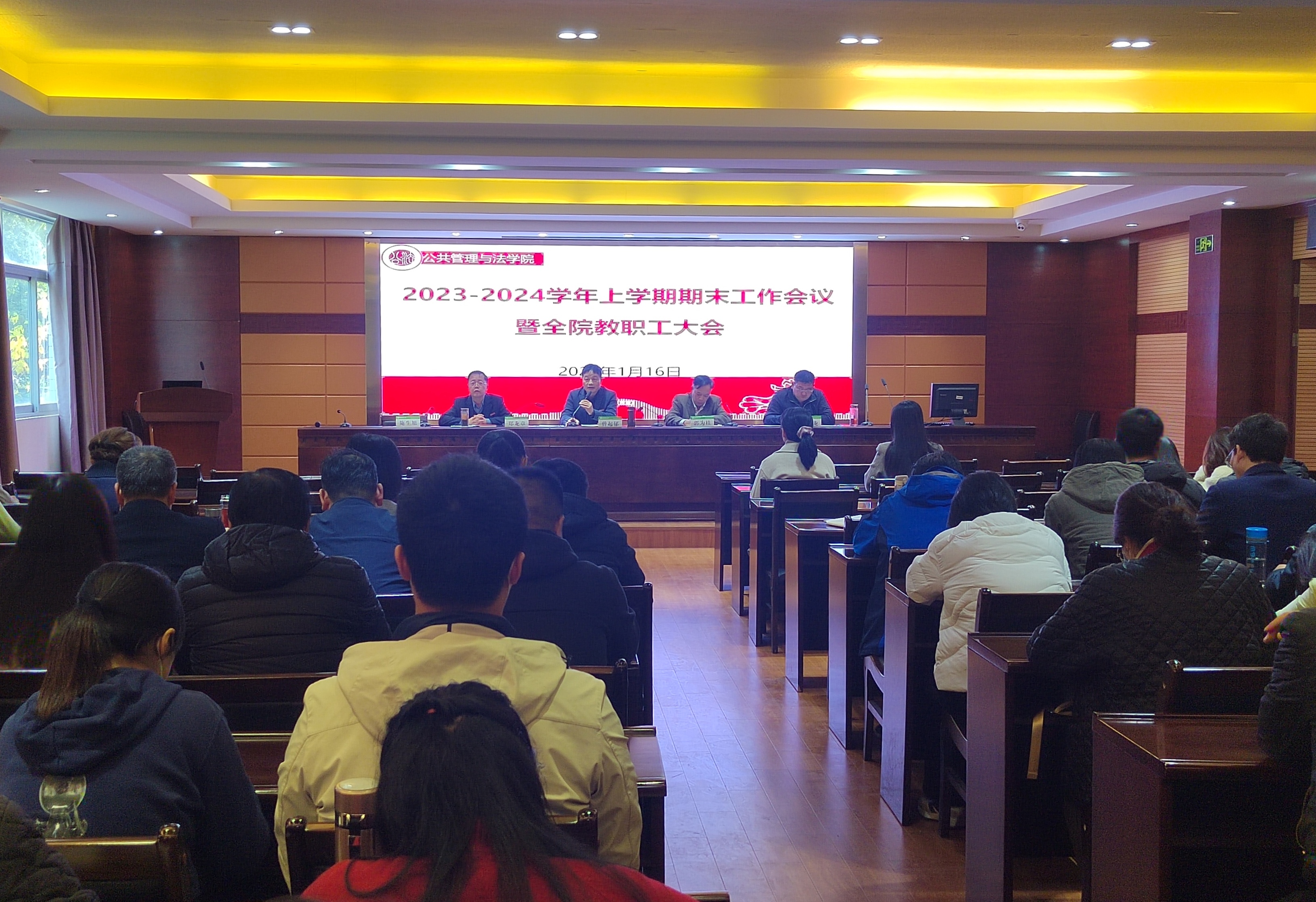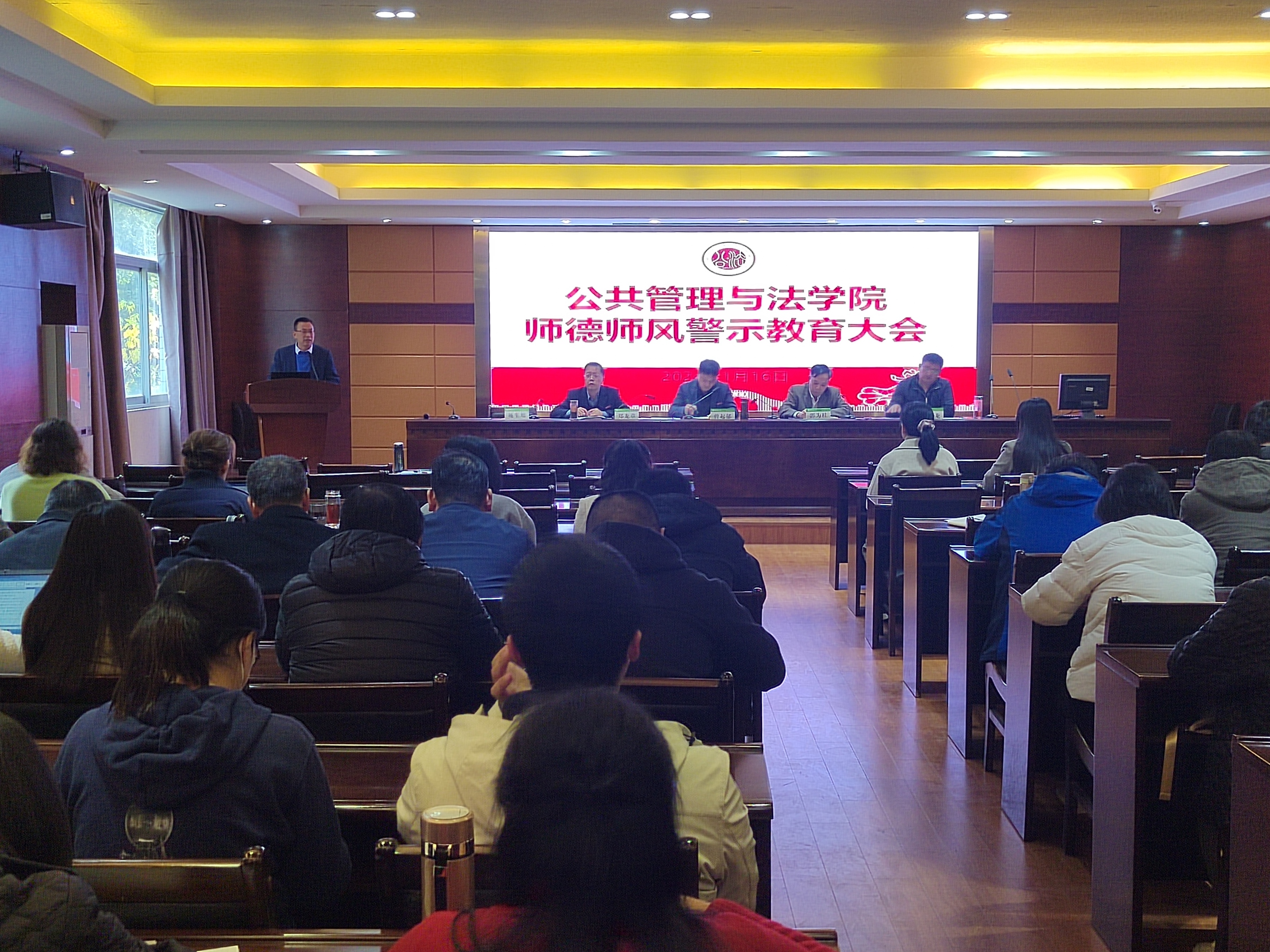 1月16日下午,公共管理与法学院在学院三楼报告厅召开期末教职工大会暨师德师风警示教育会,学院领导班子成员、全体教职工参加会议,学院党委书记曾起郁主持会议。