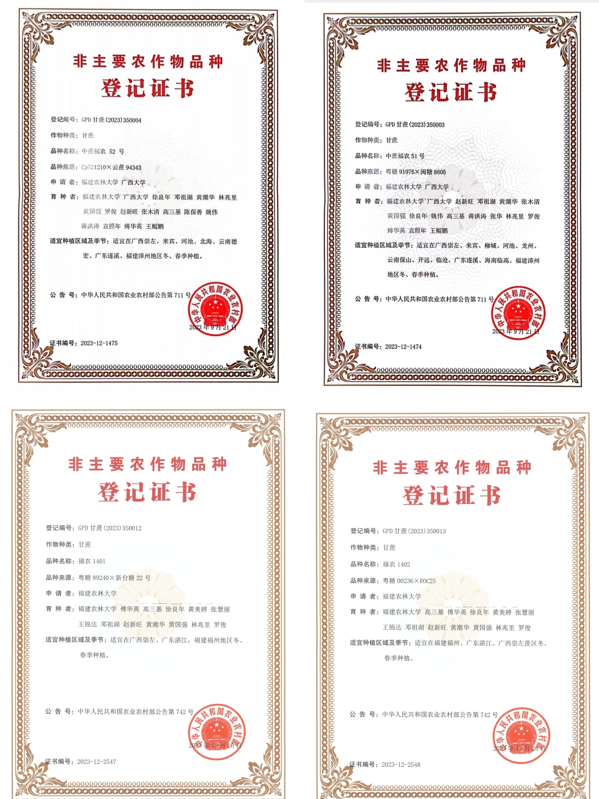 2023年,我校国家甘蔗工程技术研究中心选育的4个甘蔗新品种通过农业农村部非主要农作物品种登记。分别为邓祖湖团队选育的“中蔗福农51号”和“中蔗福农52号”(《中华人民共和国农业农村部公告 第711号》),以及高三基研究员团队选育的 “福农1401”和“福农1402” 《中华人民共和国农业农村部公告 第742号》。
