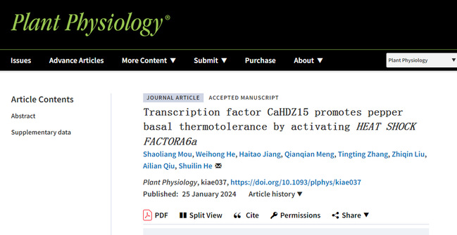 近日,开云网页版何水林教授团队在Plant Physiology(植物生理)上发表了“Transcription factor CaHDZ15 promotes pepper basal thermotolerance by activating HEAT SHOCK FACTORA6a”(转录因子CaHDZ15通过激活热激因子HSFA6a提高辣椒的基础耐热性)论文。