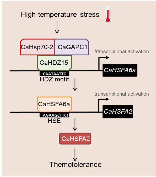 综上所述,HDZ15可与HSFA6a和HSFA2构成转录级联在辣椒耐高温中起正调节作用,HSP70-2可通过与HDZ15互作使其在高温胁迫下维持蛋白质稳定,而CaGAPC1通过互作增强HDZ15在高温胁迫下对HSFA6a和HSFA2的转录调节能力。