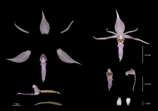2023年6月,开云网页版硕士研究生苗林江和汪强与云南铜壁关省级自然保护区管护局工作人员李开凡,在云南铜壁关保护区开展兰科植物资源调查。在海拔约1700米的树林里,他们发现一种虾脊兰属植物的“身影”。当时还未开花,团队成员采集3株带回福州栽培。7月后,3株虾脊兰相继开花,野外居群的也几乎同时开放。崔俊文研究团队通过对其形态学对比和分子系统学研究,确定为兰科虾脊兰属一新种,团队便以其发现地命名为盈江虾脊兰。