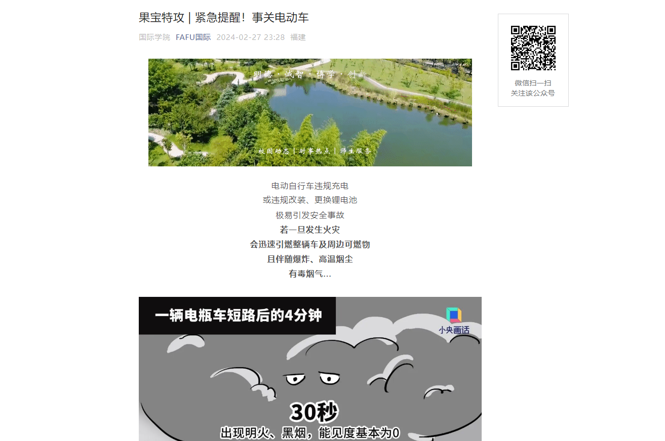 学院公众号发布电动车安全使用指南、高层建筑消防指南,并在学生宿舍楼下的学院宣传栏粘贴安全小贴士,通过线上、线下相结合的方式提高学生安全意识。