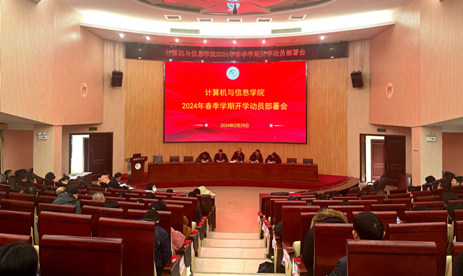 2月29日,计算机与信息学院在博学楼报告厅召开2024年春季学期开学动员部署会,深入学习贯彻习近平新时代中国特色社会主义思想和党的二十大精神,传达学校2024年春季学期开学动员部署会的会议精神。全院教职工参加会议,会议由学院党委书记钟一文主持。