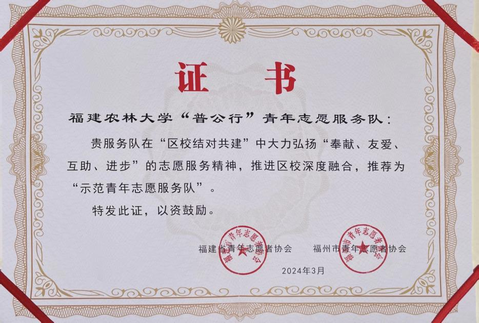 福建省青年志愿者协会授予“普公行”法律援助项目“示范青年志愿服务队”荣誉称号