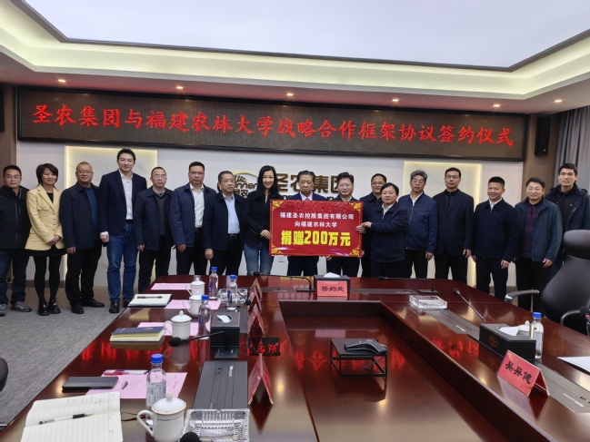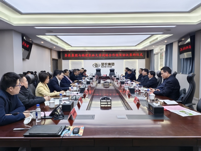 3月5日,我校与福建圣农控股集团有限公司签订战略合作框架协议。校党委书记王建南、校长兰思仁与圣农集团董事长傅光明、总裁傅芬芳座谈交流,光泽县委书记陈中民、县长王贵、常务副县长黄河共同见证签约。