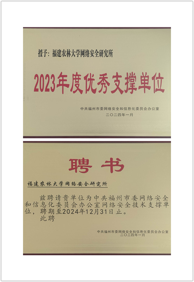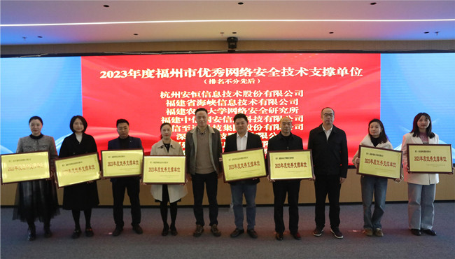 会议通报了2023年度福州市网络安全工作相关情况,总结了2023年网络安全技术支撑工作,对8家优秀支撑单位进行表彰,对51家2024年度支撑单位进行授牌。我校网络安全研究所被授予“2023年度优秀支撑单位”“2024年度网络安全技术支撑单位” 。