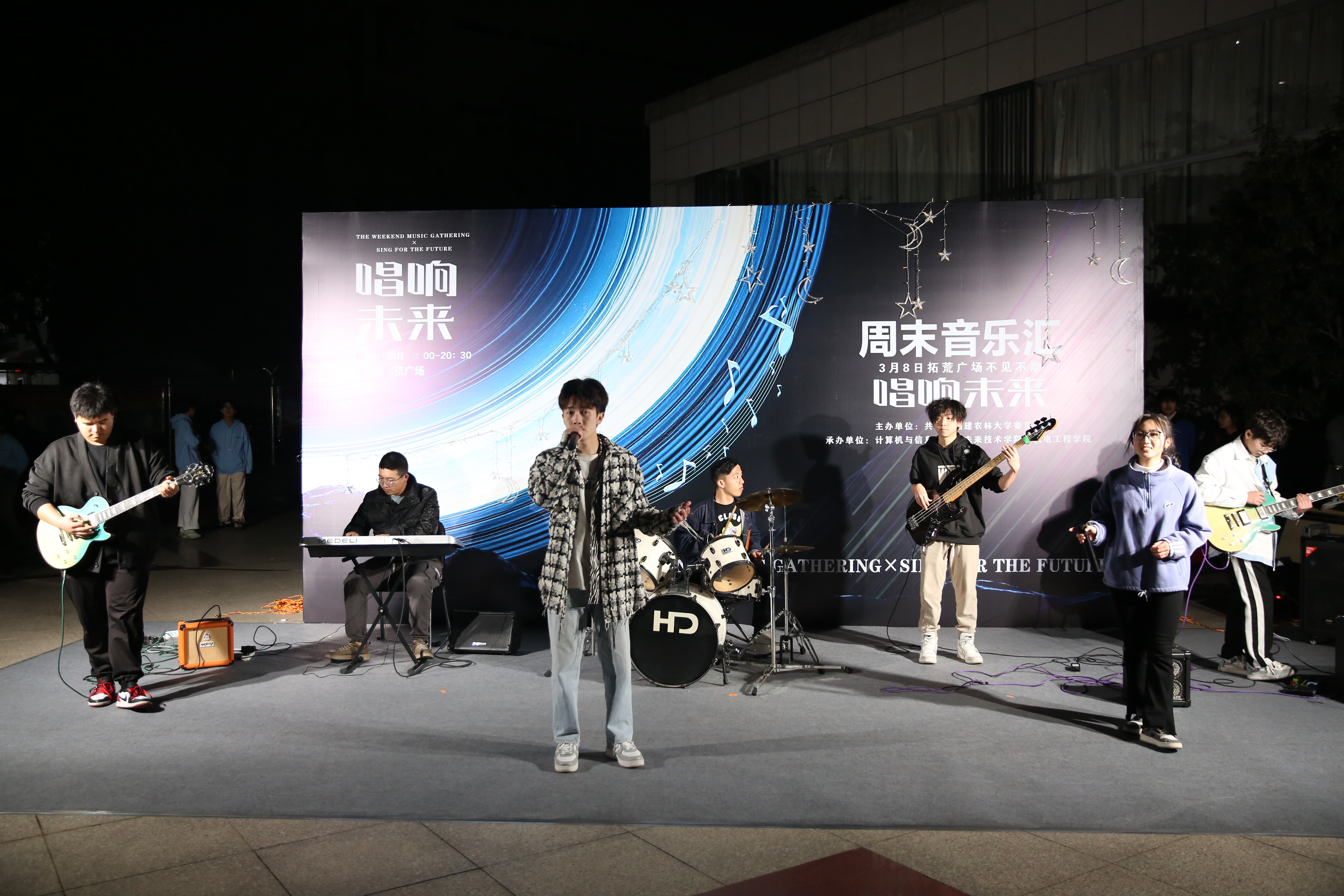 为营造昂扬向上、充满活力、文明高雅的校园文化氛围,3月8日晚,由校团委主办、计算机与信息学院参与承办的开云网页版“唱响未来”周末音乐汇在金山校区拓荒广场举行。