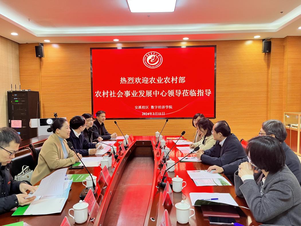 3月11日下午,农业农村部农村社会事业发展中心副主任詹慧龙一行莅临数字经济学院调研考察并于校区协同创新中心召开座谈会。福建省农业农村厅科教处、泉州市农业农村局、安溪县政府及相关部门领导陪同调研。数字经济学院院长郭玉琼、副院长吴义炳以及相关专业教师代表参加座谈。
