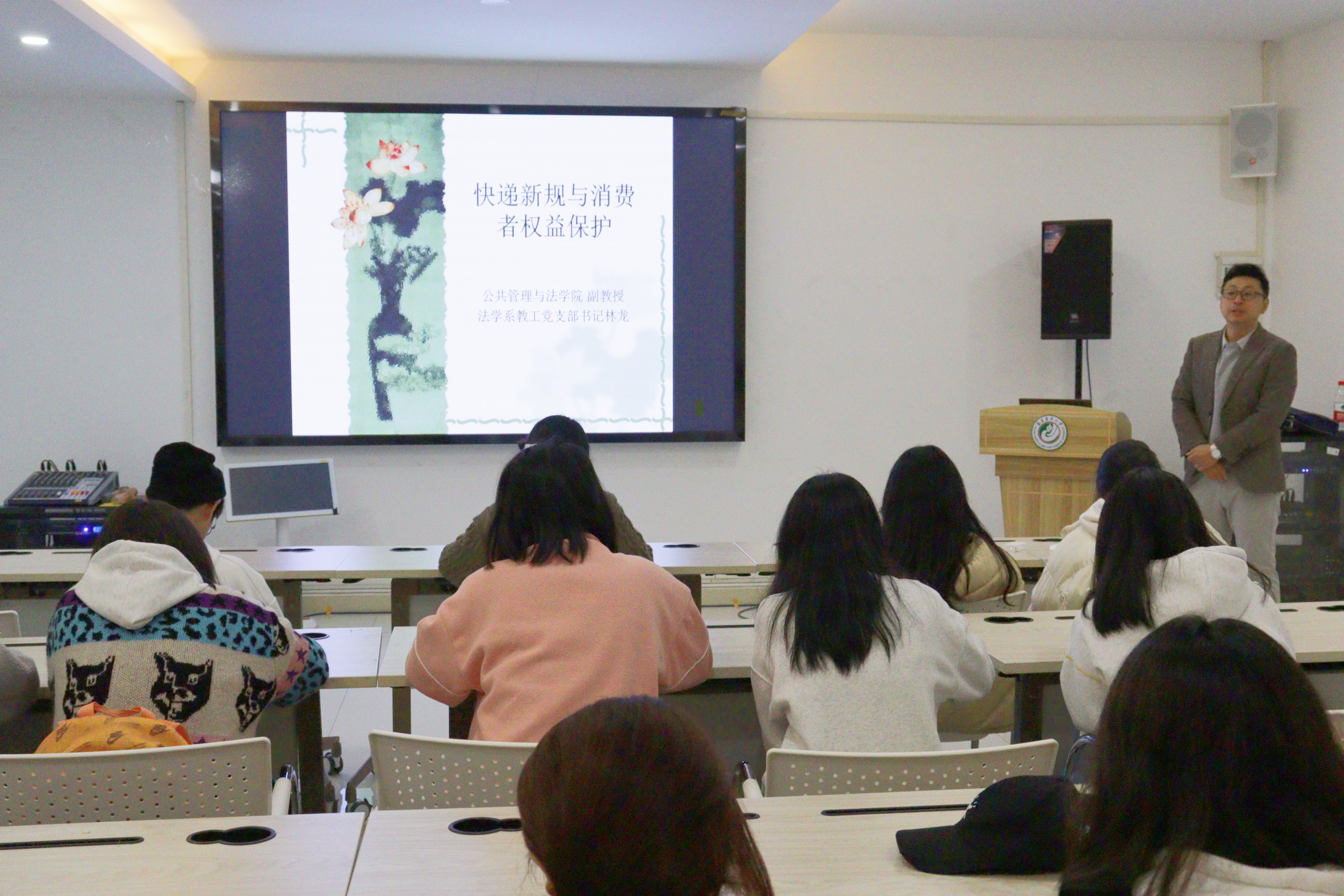 当晚,党支部还邀请到公共管理与法学院法学系教工党支部书记林龙老师开展以“快递新规与消费者权益保护”为主题的普法讲座。他从近日施行的《快递市场管理办法》切入,针对新规保障消费者知情权、明确权利义务关系等亮点进行详细解读,结合案例阐释快递收件与消费者权益保障之间的密切法律联系。同时,他就新规存在的例如“擅自代收快递仍无具体救济措施”“快递在代收点丢失的责任承担问题”等争议点进行发问,同学们各抒己见、激烈讨论。最后,老师也对快递缺件、丢失等现象分享“法律干货”,希望同学们遇到此类情况都能正确处理、依法维权。