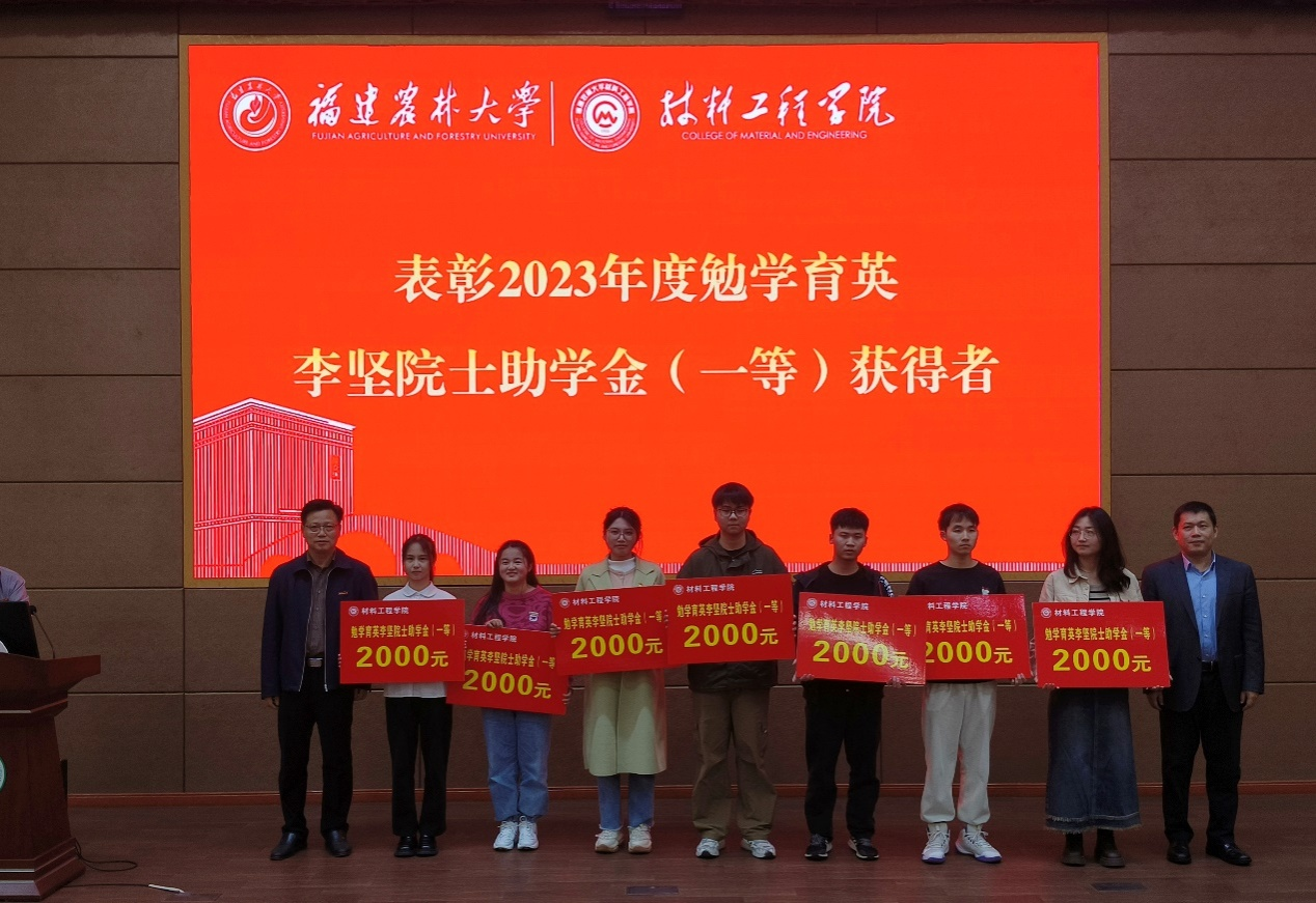 会上,郭朝晖宣读了材料工程学院2023年度勉学育英学业奖学金、生物质基材料研究生奖学金、突出贡献奖学金、李坚院士助学金、玖龙助学金等113项个人奖和团队奖的获奖名单,同时向全体获奖学生表示热烈祝贺,并对各位企业、校友的捐资助学表示衷心感谢。随后举行颁奖仪式,院领导林豪森、余雁、陈奶荣、罗小林分别为获奖学生代表颁奖。