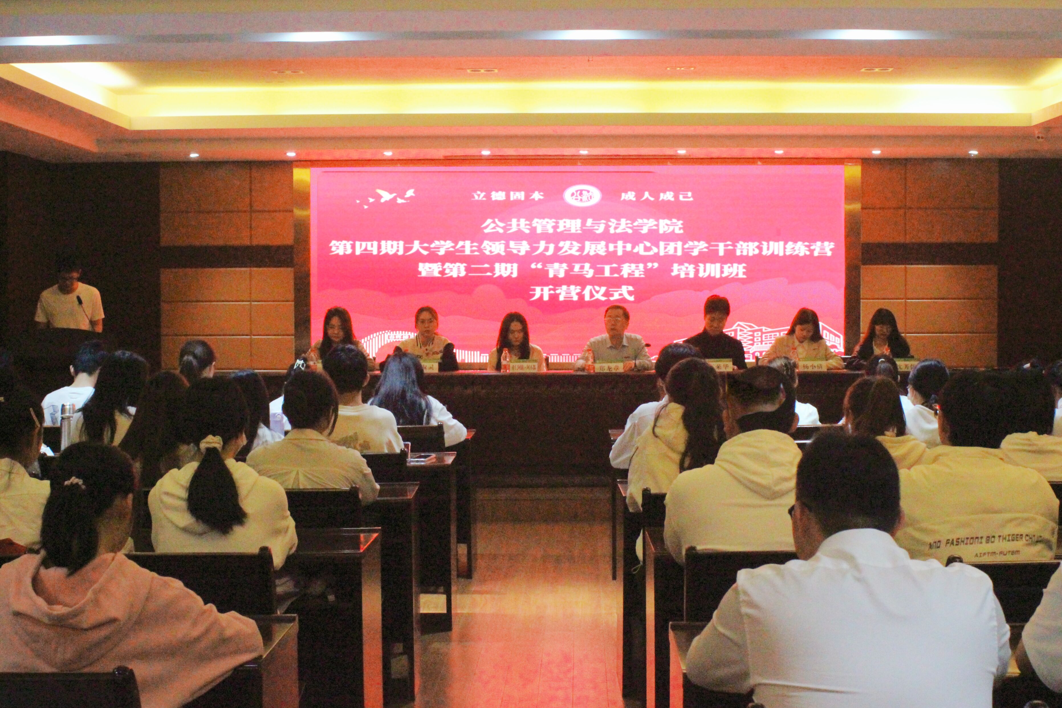 3月26日晚,公共管理与法学院第四期大学生领导力发展中心团学干部训练营暨第二期“青马工程”培训班开营仪式在学院3楼会议室举行。学院党委副书记郑龙章、团委书记王荣华、全体辅导员与学员一起参加会议,开营仪式在庄严的国歌声中拉开序幕。