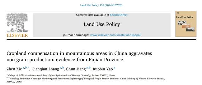 近日,我校公共管理与法学院土地资源管理系谢臻博士团队在土地资源管理类权威国际期刊Land Use Policy(《土地利用政策》)(IF=7.1) 上发表研究文章“Cropland compensation in mountainous areas in China aggravates non-grain production: evidence from Fujian Province”(《山区耕地补偿加剧“非粮化”:来自福建省的证据》)。