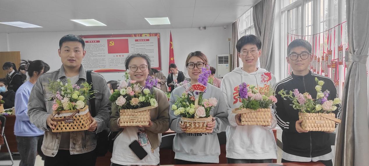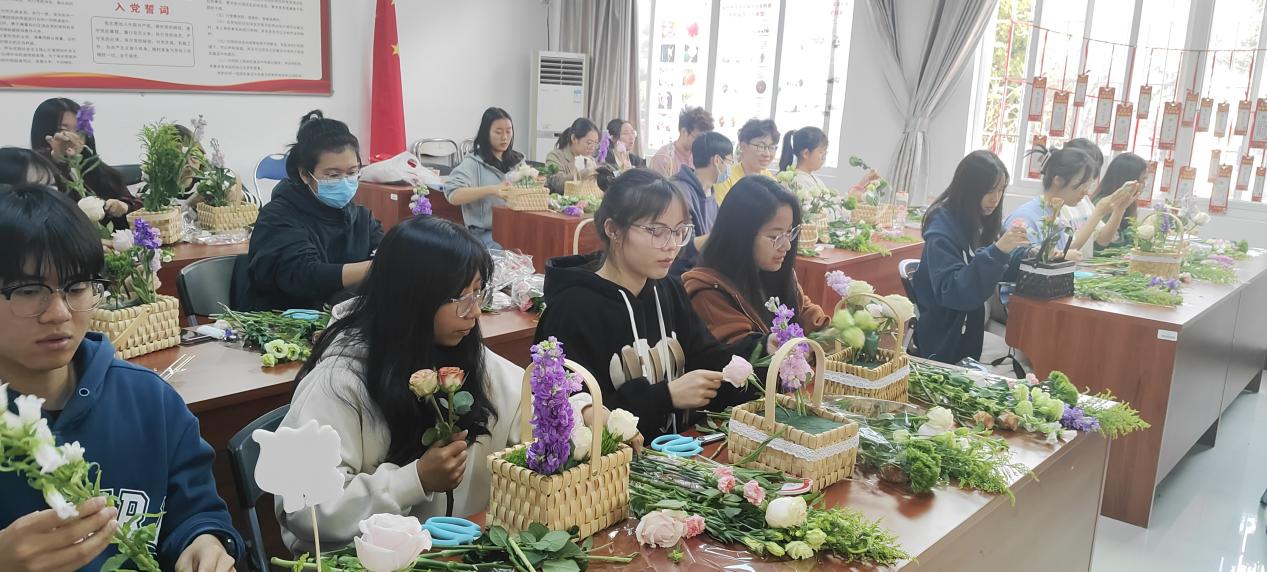 签约仪式后,同学们体验了猜灯谜活动,感受花文化的魅力。福州市花卉协会秘书长、福州市劳模、技能大师陈熙为校大学生花卉园林协会和花艺队的成员们带来一节精彩的花艺课,让同学们感受到了“插花”这一中华优秀传统技艺的深刻内涵。在实践环节中,同学们在老师的指导下运用娇艳的鲜花制作出一个个高低错落、疏密有致的红色主题花篮。每一个作品都饱含着他们对先烈们的敬仰和对美好生活的热爱。