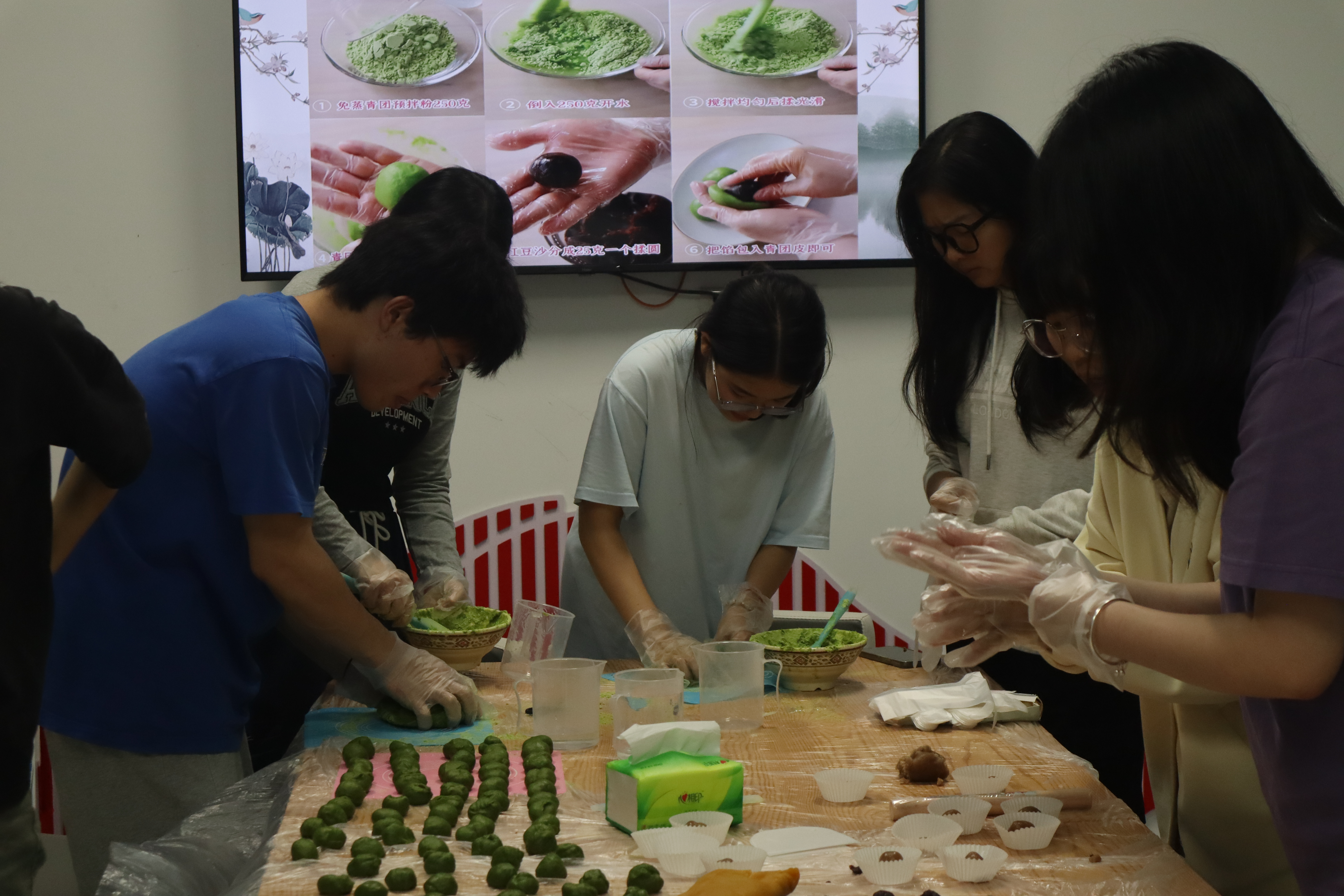 包青团,忆清明。志愿者向同学们介绍青团的由来,并带领大家一起和糯米粉、揉面团、调馅料、搓团子。通过制作青团,同学们亲身感受了中华优秀传统文化的独特魅力,潜移默化引导同学们树立起认知传统、尊重传统、继承传统、弘扬传统的思想观念。