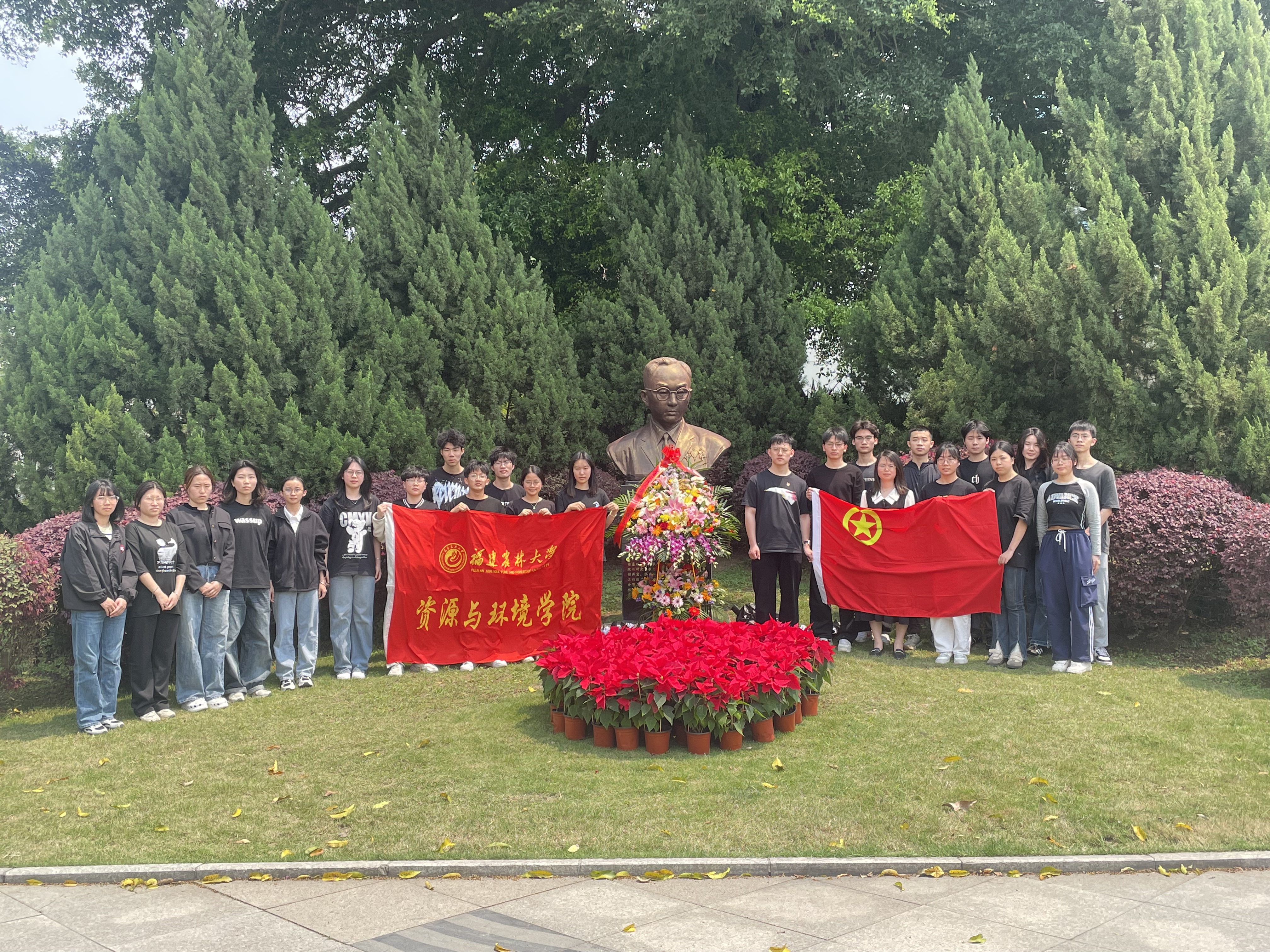 手工花,祭先贤。志愿者向同学们讲授手工菊花的技巧和制作流程,在志愿者的指导下,同学们亲手制作花束,用绿色环保的方式缅怀先贤,寄托哀思。手工花制作结束后,师生代表前往严家显先生铜像前,整齐列队,深深三鞠躬,并依次献上手工制作的花束,深切缅怀著名昆虫学家、教育家严家显先生为创办和发展福建高等农林教育事业所作出的重大历史贡献。