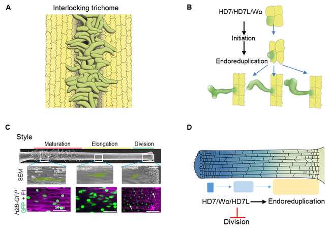 本研究首先发现现代栽培番茄的花药边缘形成了一类特殊的表皮毛结构,通过相互铰链,形成一个类似拉链的结构,将相邻的花药紧紧锁住,形成密闭的花药桶结构。通过遗传筛选,研究人员发现,当控制番茄表皮毛的关键调控因子发生负显性突变时,番茄闭花授粉结构被破坏,花药散开的现象。研究人员进一步鉴定到此负显性突变影响的多个关键基因。这些关键基因同属于一类可以激活下游基因表达的HD-Zip IV转录因子。它们不但在番茄花药锁扣表皮毛起始细胞中高表达,并且通过蛋白浓度剂量效应调控锁扣表皮毛的起始和核内复制。有趣的是,这些HD-Zip IV转录因子同时也在花柱的顶部区域高表达,同样通过浓度剂量调控花柱细胞的核内复制,进而促进花柱的极性伸长。