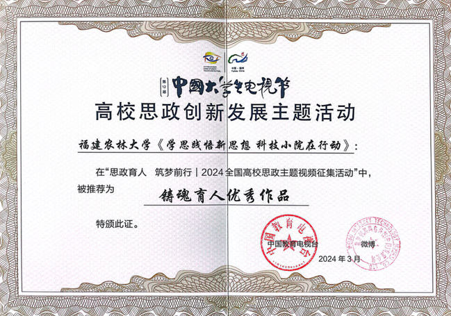 近日,由中国高等教育学会、中国教育电视台、福建省教育厅和微博联合主办的第十二届中国大学生电视节“高校思政创新发展主题活动”公布获奖名单,学校获“微博2023最具贡献力高校”,学校融媒体中心制作选送的作品《学思践悟新思想,科技小院在行动》系列视频获2024年度全国高校思政主题视频征集活动“铸魂育人优秀作品”奖。
