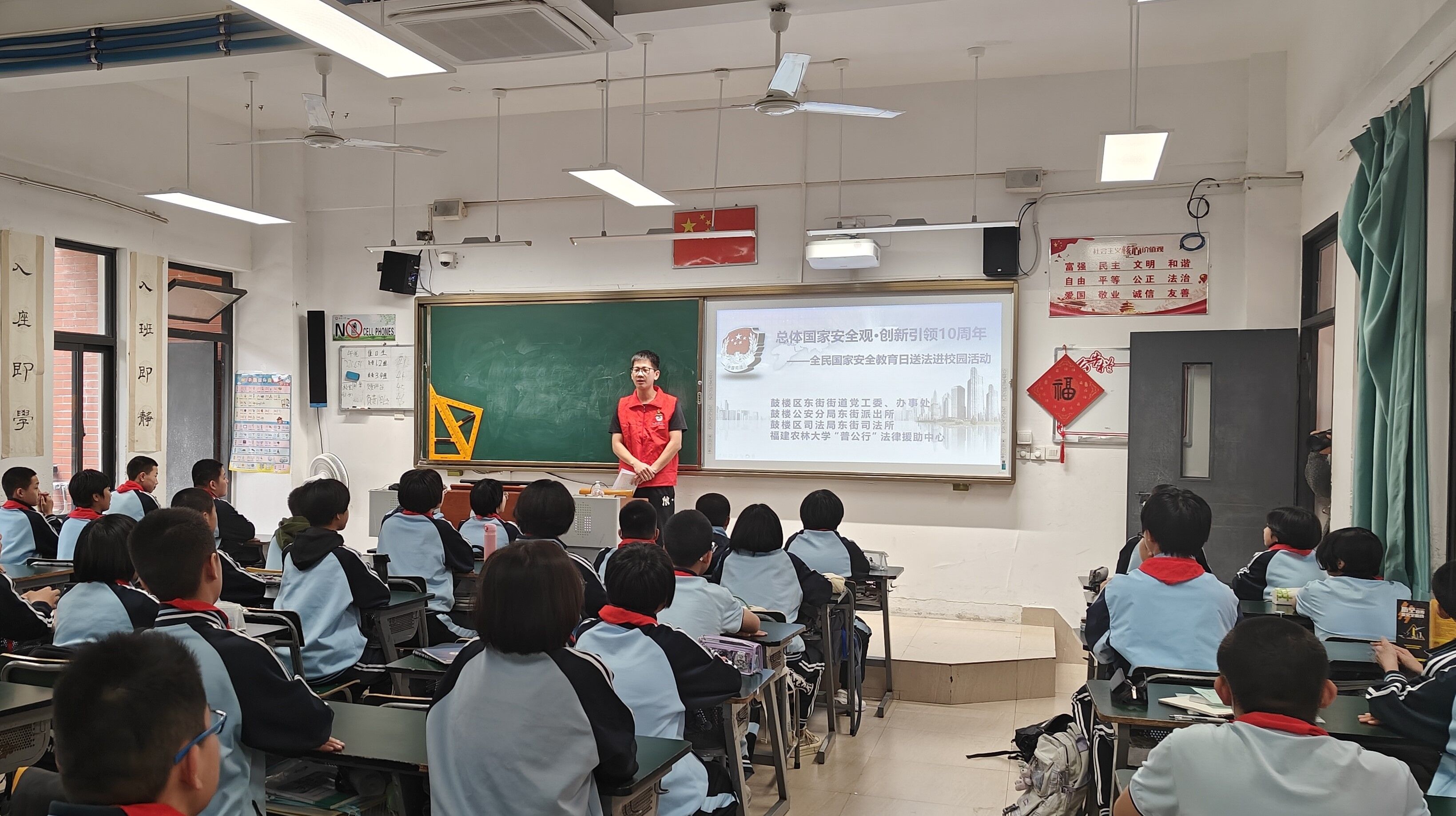 4月10日,党支部联合鼓楼区东街街道党工委、办事处、东街派出所、东街司法所一同前往福州一中(初中部)开展普法宣讲活动。宣讲员郭弘毅紧扣“总体国家安全观·创新引领十周年”主题,以时事热点、警示案例为切入口,结合《宪法》《刑法》《国家安全法》等国安相关法律法规,详细介绍“国家安全的概念及种类”“总体国家安全观的提出、内涵及发展”“危害国家安全的行为”“日常生活中如何维护国家安全”等内容,并鼓励同学们从自身做起,从小事做起,“肩并肩”护航新时代国家安全。