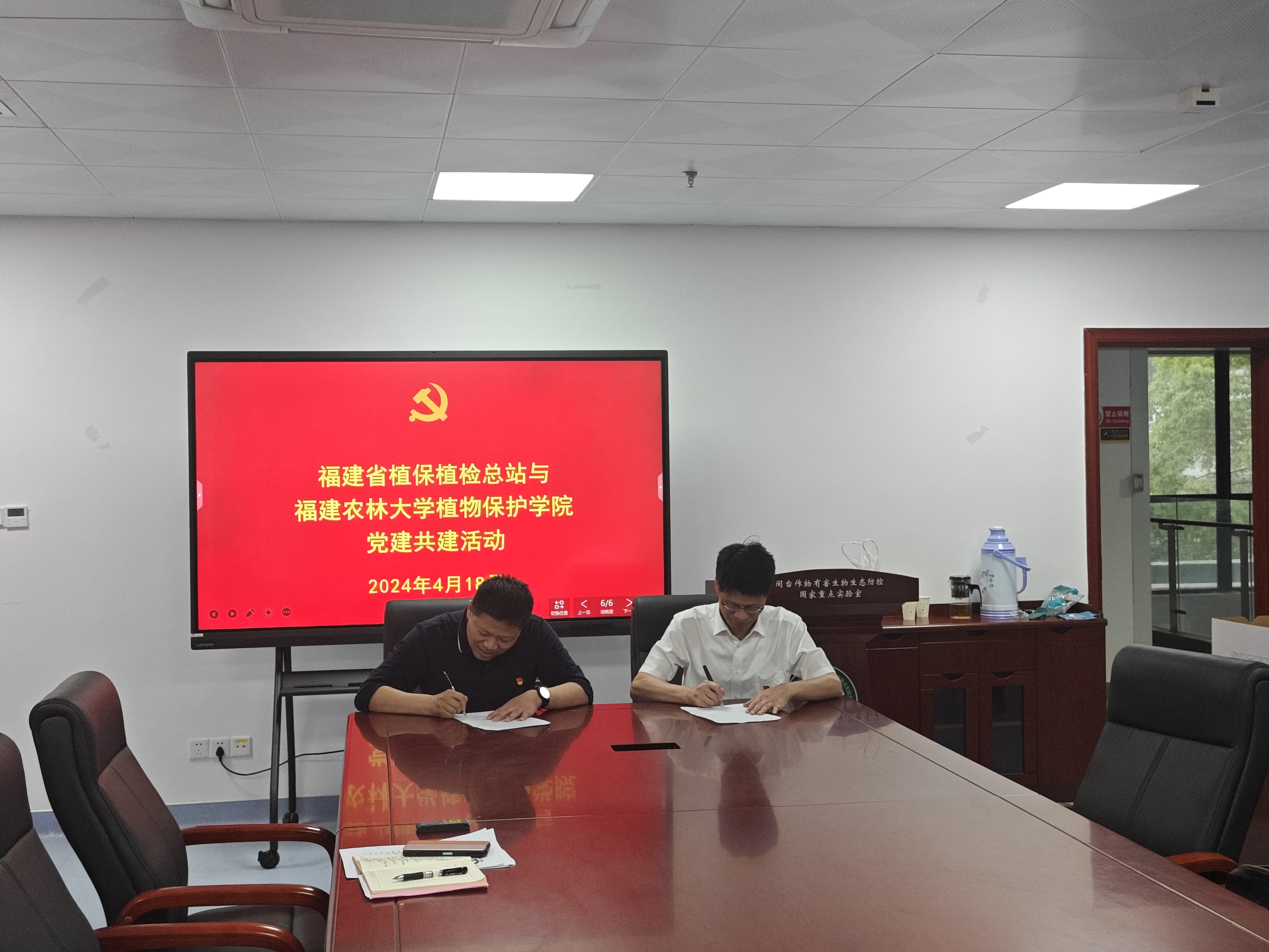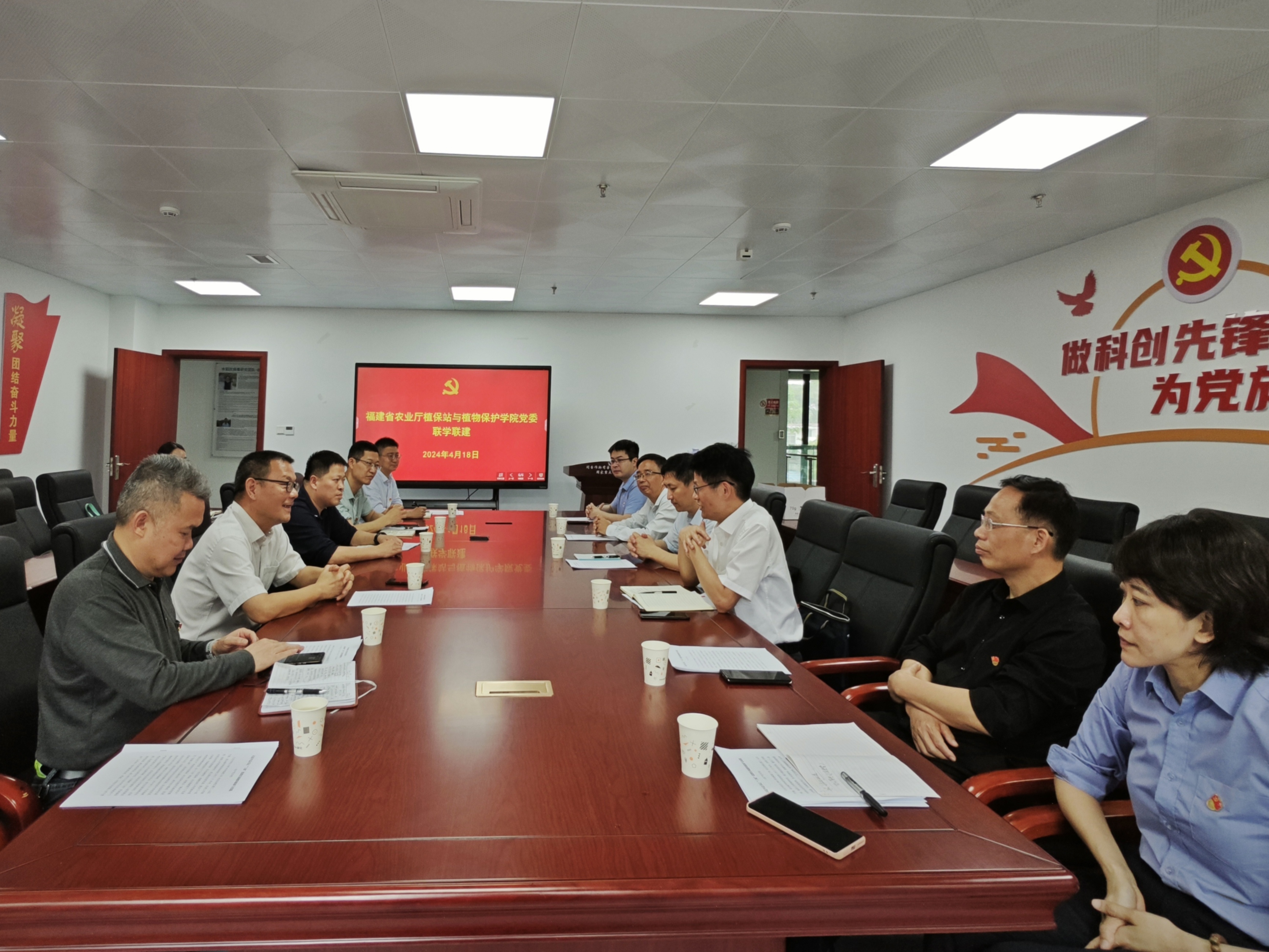 4月18日下午,福建省植保植检总站党支部和植物保护学院党委理论学习中心组在国家重点实验室党员活动室开展联学共建活动,聚焦农业新质生产力发展,集中学习习近平总书记关于“三农”工作的重要论述,共同探讨开展有组织的科学研究、更好服务乡村振兴和生态安全的时代命题,并签署党建共建协议。省植保植检总站站长赖万炎,副站长陈军,植物保护学院领导沈必胜、侯有明、陈文滨、郑文辉等参加活动。