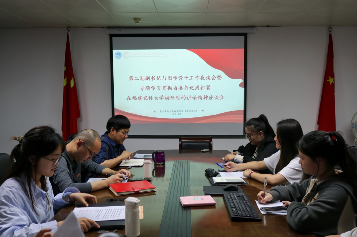 会议强调,一要加强学习宣传贯彻。要深入学习宣传贯彻省委书记周祖翼来校调研时的讲话精神,通过大学生研习社、青马工程带头示范学与团支部全覆盖学,团学骨干要发挥作用带头示范学,把学习成效转化为干事创业的强大动力,为建设农林特色鲜明全国一流大学贡献青春力量,在服务福建农业产业高质量发展展现青春担当。二要提高国际传播能力。要深刻领会习近平总书记给林占熺研究员及菌草援外团队重要勉励精神的重大意义和丰富内涵,注重发挥学院合作办学项目和英语专业特色,翻译菌草技术、菌草对外援助与可持续发展等文章,讲好习近平总书记关心关怀菌草事业发展的故事,讲好菌草援外的中国故事,践行习近平外交思想,提高国际传播能力,服务“一带一路”倡议和大外交战略。三要练就强农兴农本领。要提升专业素养,把课堂学习和实践相结合,发挥农林学科特色优势,积极践行“大食物观”,厚植爱农情怀、练就强农兴农本领,争做知农、爱农、兴农的农业人才,投身农业发展,在乡村振兴的大舞台上建功立业。