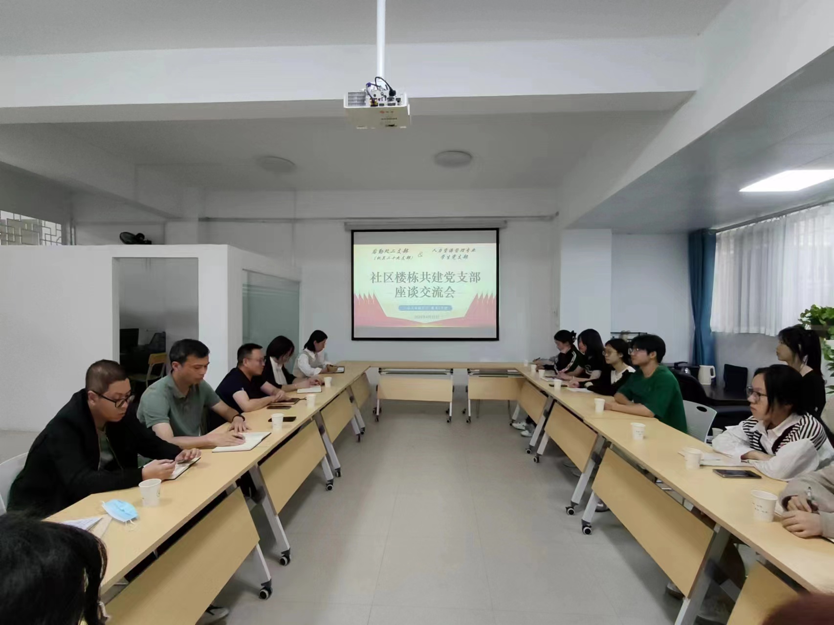 为进一步贯彻落实校党委关于开展机关党支部与学生党支部结对共建的工作要求,本着“师生互促、双向受益”的工作理念,4月19日下午,后勤管理处第二党支部(机关第二十九党支部)与经济与管理学院人力资源管理专业学生党支部在后勤管理处教室宿舍管理科会议室召开支部共建座谈会。后勤管理处第二党支部全体党员、人力资源管理专业学生党支部师生代表共同参加座谈。