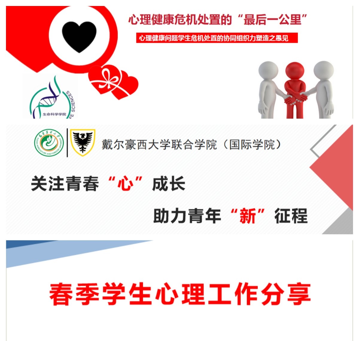 随后,生命科学学院党委副书记刘强、戴尔豪西大学联合学院(国际学院)党委副书记刘敏以及大学生心理健康指导中心副教授胡庆庆,则围绕大学生心理健康教育及突发事件应对主题,分别作题为《心理健康危机处置的“最后一公里”》《关注青春“心”成长 助力青年“新”征程》《春季学生心理健康工作》的专题分享,并与现场同志深入交流、交换了工作经验与心得。大家一致认为,心理健康关系大学生的校园生活与成长成才,应持续强化统筹指导、部门协同、家校联系,共同发力为大学生健康成长保驾护航。
