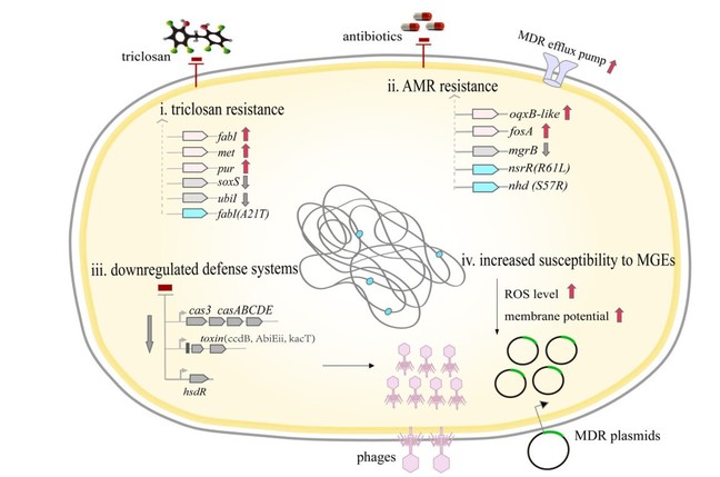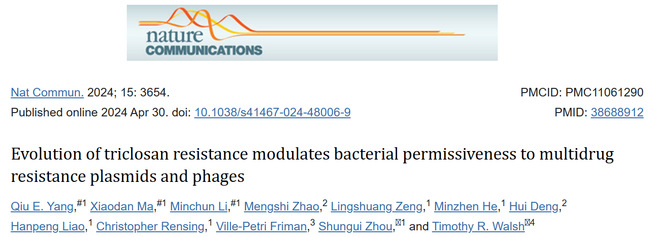 抗微生物药物耐药性(AMR)已成为发病率和死亡率的主要原因,2022年Lancet论文报告指出,在2019年204个国家和地区由于AMR导致的死亡人数高达495万人,表明抗生素的过度使用加剧了全球AMR负担。越来越多的证据表明,包括消毒剂在内的非抗生素类杀菌化合物也会间接导致抗生素耐药性,如具有广谱抗菌活性的杀菌化合物—三氯生(TCS),其被广泛应用于肥皂、牙膏等2000多种日用品中,并在水体、土壤等多种环境中被检测到。据相关文献报道,TCS耐药性增加与细菌对其他抗生素的耐药性升高存在直接关系,但其对抗生素交叉耐药的机制,尚不明晰。