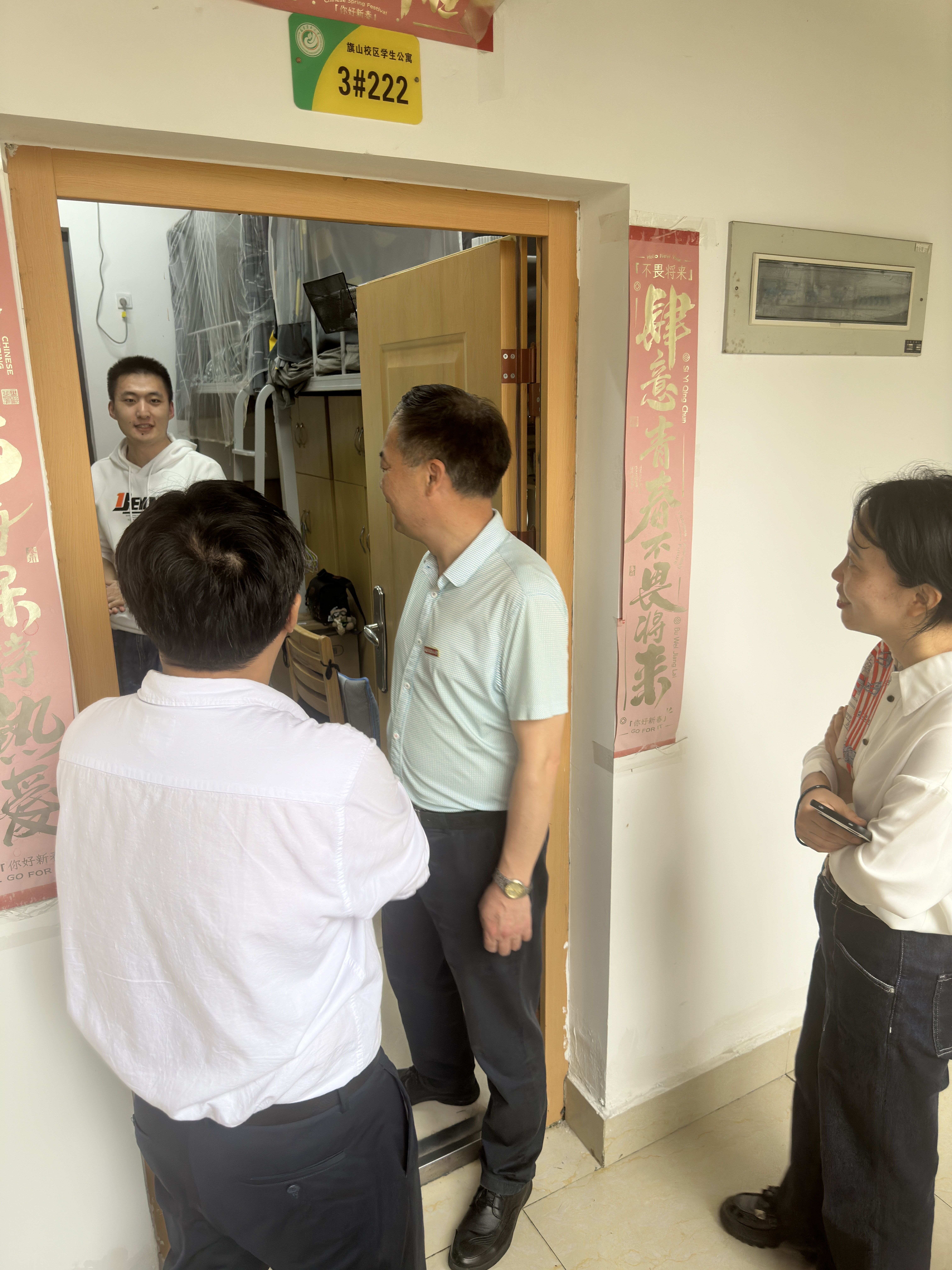 随后,陈为德一行深入学生宿舍开展安全检查,走访了解学生假期去向、毕业生就业情况等,并在“一站式”社区开展安全工作具体部署。会议强调,安全无小事,责任大于天,全院师生必须要提高思想站位,增强责任意识,辅导员要以时时放不下心的责任感加强对学生防火用电、防汛防溺水、防诈骗、防安全事故等安全意识的提醒,值班同志要努力提升应急处理能力,共同织密织牢校园安全“防护网”。