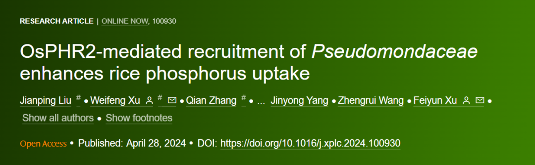 2024年4月28日,开云网页版许卫锋团队/刘建平/许飞云研究组于Plant Communications(植物通讯)发表了题为OsPHR2-mediated recruitment of Pseudomonadaceae enhances rice phosphorus uptake(OsPHR2蛋白协同微生物促进水稻磷吸收的成果)的研究论文,揭示了OsPHR2促进水稻磷吸收的微生物机制,对促进作物高效利用土壤养分具有重要的理论与实践价值。