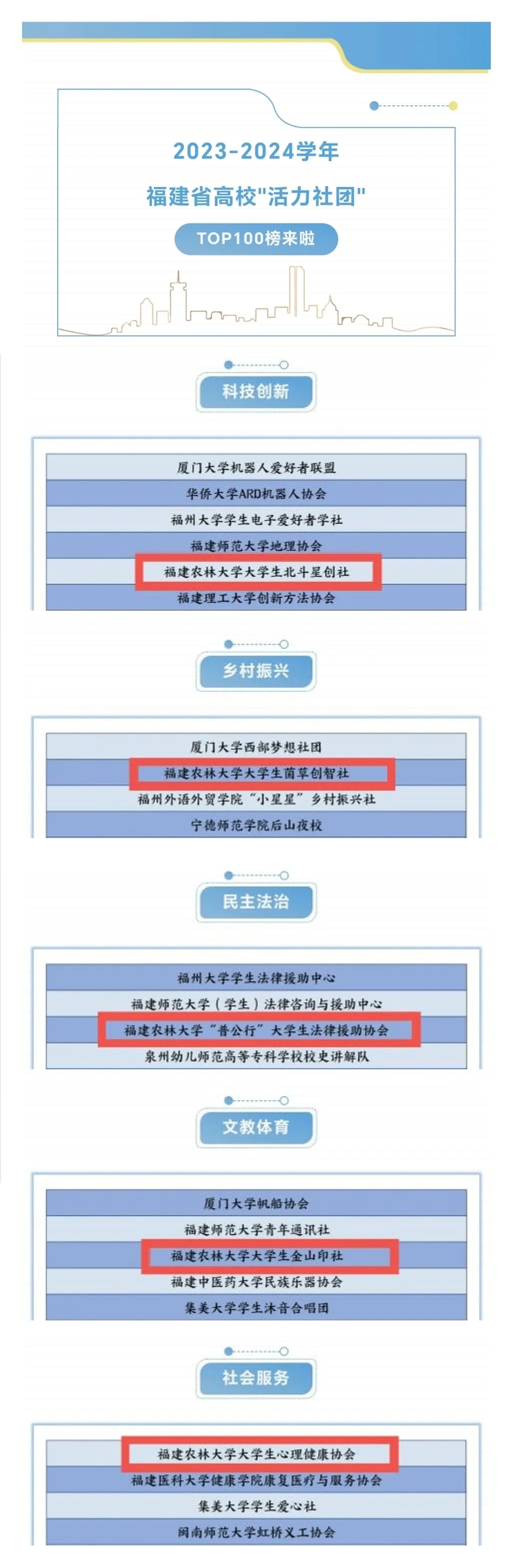近日,由团福建省委学校部、福建省学联组织开展的2023-2024学年福建省高校“活力社团”TOP100榜发布。我校大学生北斗星创社、大学生菌草创智社、“普公行”大学生法律援助协会、大学生金山印社、大学生心理健康协会等5个学生社团荣登榜单。