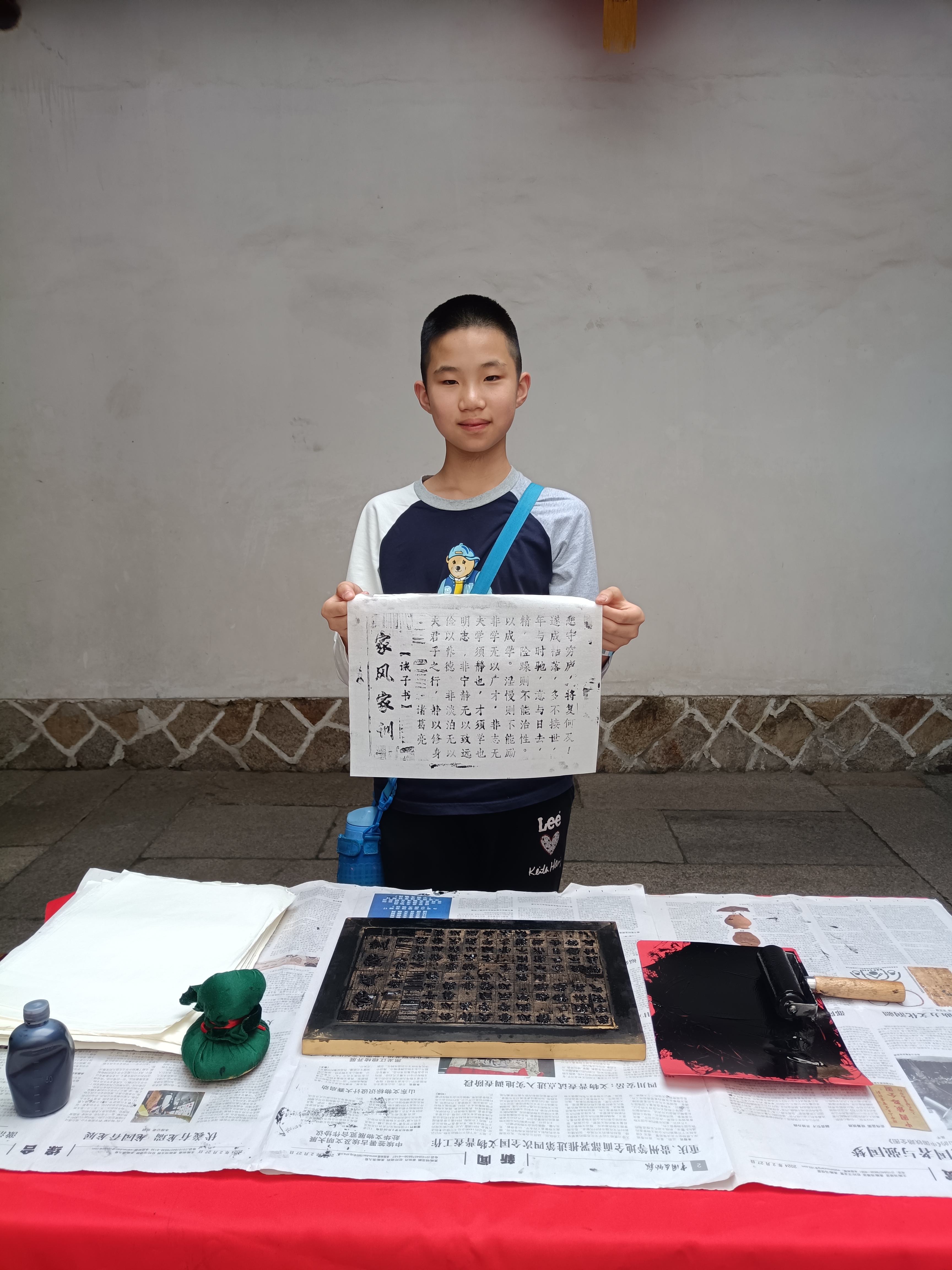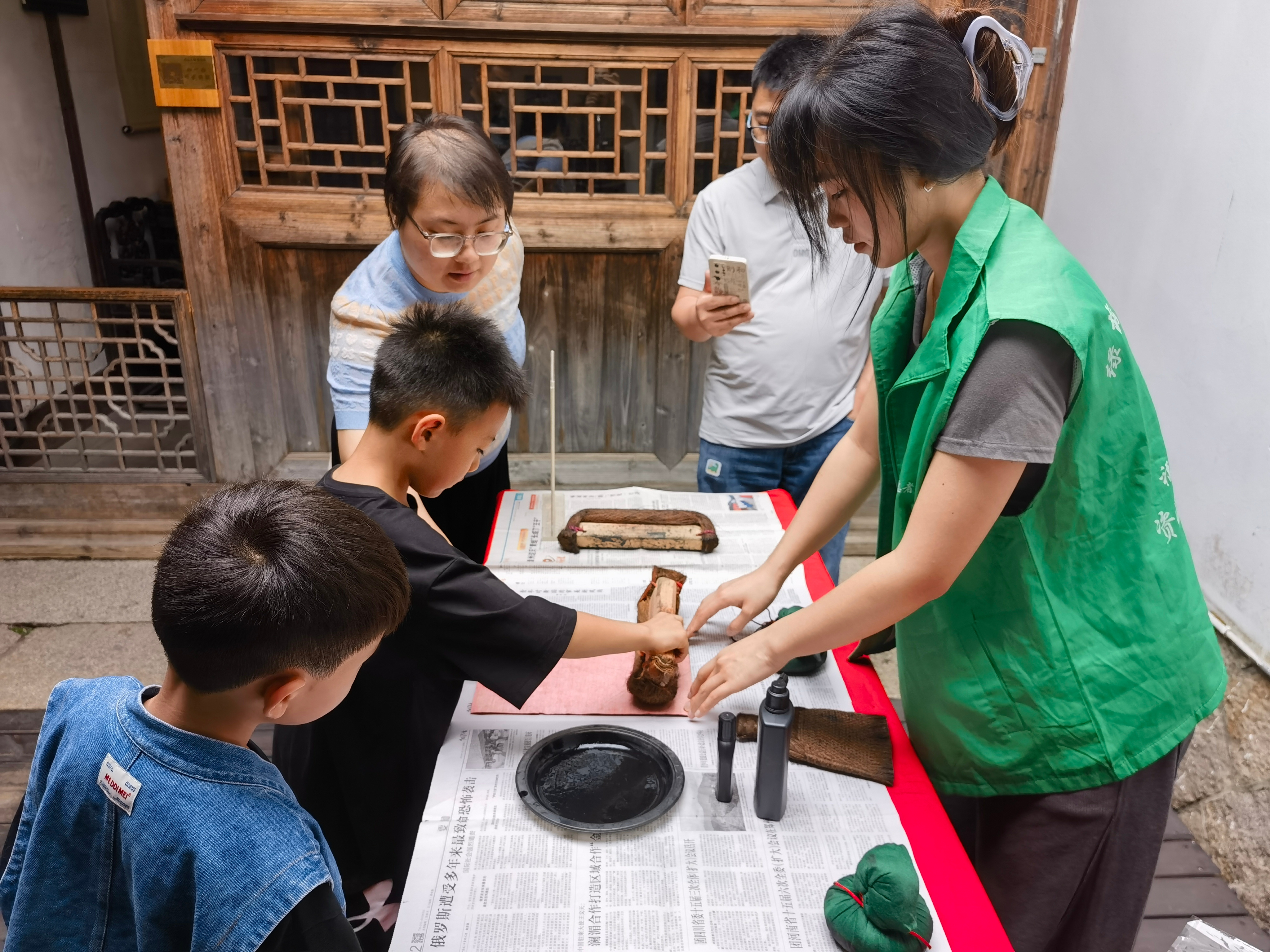 非遗活字印刷体验。非遗活字印刷活动以家风家训为主题,志愿者协助游客通过滚筒将油墨均匀涂抹在活字印刷板上后,将宣纸放在合适的位置上,使印刷内容居中,再用毛刷以适当的力度刷压,取下宣纸后印刷的内容就完美呈现在纸上了,游客们一滚一刷中领略了千年活字印刷的魅力,感受了历史的厚重与艺术的韵味。