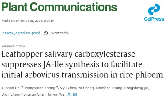 2024年5月9日,植物保护学院魏太云研究员团队在Plant Communications(《植物通讯》)在线发表了题为"Leafhopper salivary carboxylesterase suppresses JA-Ile synthesis to facilitate initial arbovirus transmission in rice phloem "(叶蝉唾液羧酸酯酶抑制茉莉酸异亮氨酸的合成促进虫媒病毒在水稻韧皮部的初始传播)的论文,揭示了电光叶蝉唾液蛋白CarE10作为唾液效应子通过抑制JA-Ile合成来操纵宿主对介体昆虫的吸引力,从而促进植物病毒的水平传播,为解析媒介昆虫高效传播植物病毒的复杂机制奠定了研究基础。