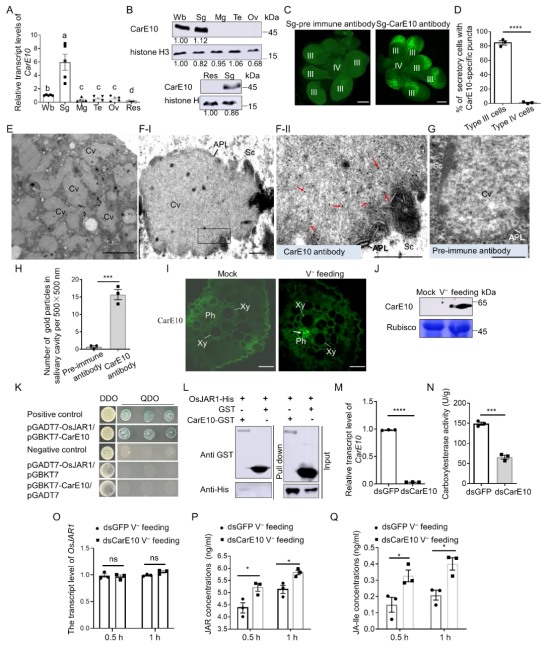 图1.唾液蛋白CarE10分泌至水稻韧皮部与OsJAR1互作并抑制水稻JA-Ile合成