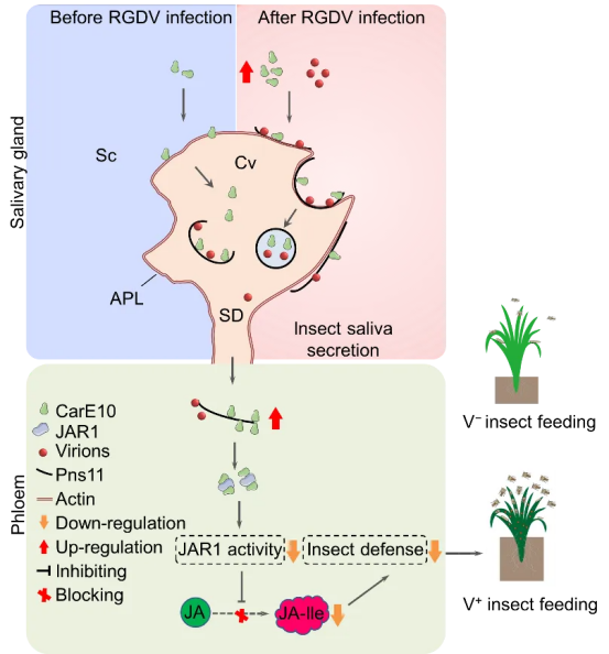 水稻瘤矮病毒(Rice gall dwarf virus, RGDV)是一种由电光叶蝉(Recilia dorsalis)作为主要传播介体,以持久增殖型方式传播的水稻呼肠孤病毒。RGDV通过多种方式逃避介体免疫,突破介体屏障,进入昆虫唾液腺,最终随唾液分泌到水稻中,严重威胁水稻的生产安全及产量品质。该研究以RGDV及其介体电光叶蝉为研究对象,筛选出受RGDV调控显著上调表达的唾液蛋白羧酸酯酶(Carboxylesterases, CarEs)。通过对叶蝉体内CarEs基因的克隆及表达分析,发现CarE10在唾液腺中 特异性的高表达,并广泛分布于唾液腺三型腺泡及唾液腔中,在叶蝉取食时可随唾液释放至水稻韧皮部。进一步研究发现CarE10与水稻茉莉酸酰胺合成酶(OsJAR1)存在互作,并且通过直接结合OsJAR1活性位点影响OsJAR1的酶活性,并通过泛素蛋白酶体促进OsJAR1的降解,进而阻断JA向JA-Ile的转化,抑制JA-Ile的合成,降低水稻中JA-Ile激素水平的积累,实现促进昆虫取食和病毒水平传播。