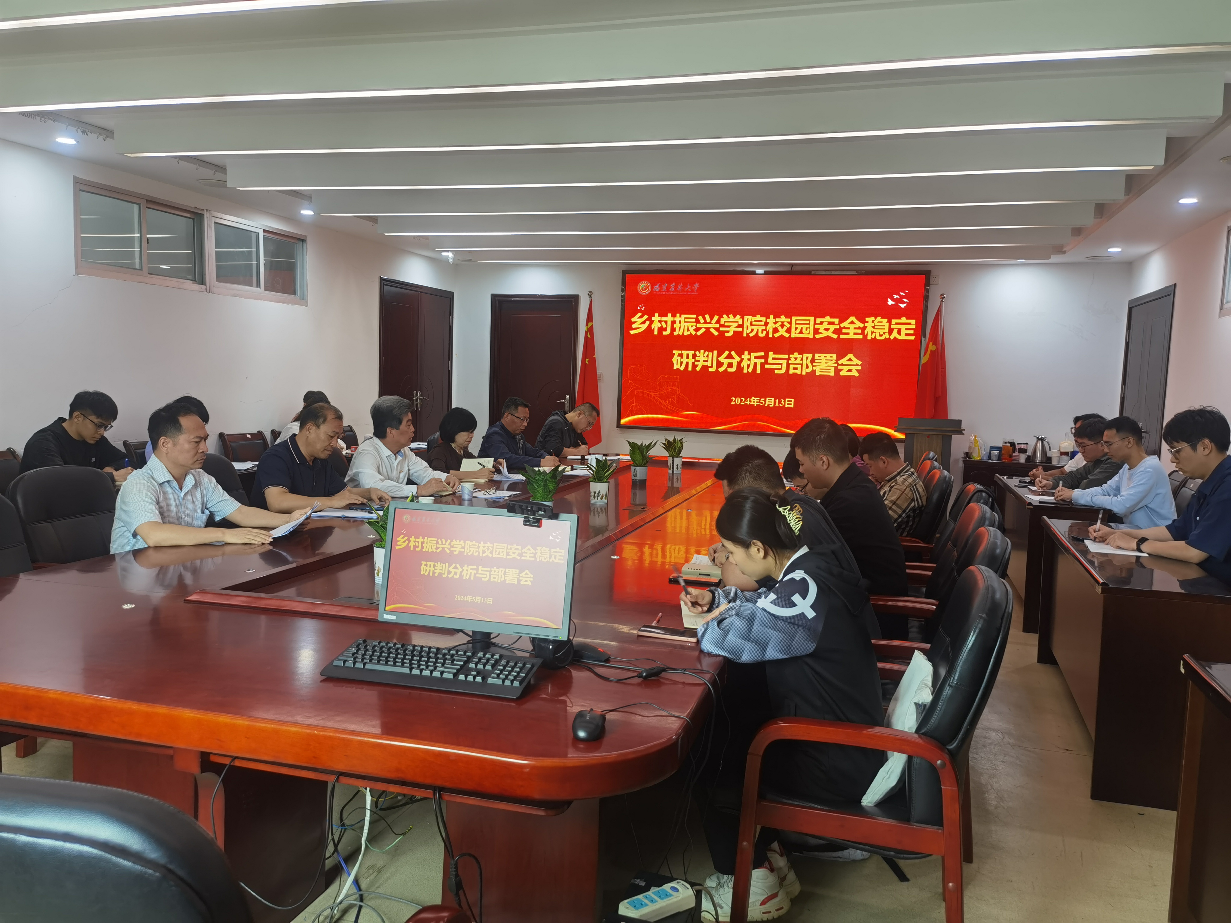 5月13日下午,乡村振兴学院在东苑512会议室召开校园安全稳定研判分析与部署会,会议由党委书记陈清西主持,学院领导班子成员、工会主席、科级干部、辅导员、系主任、学生会主要干部和团委主要干部参加了会议。