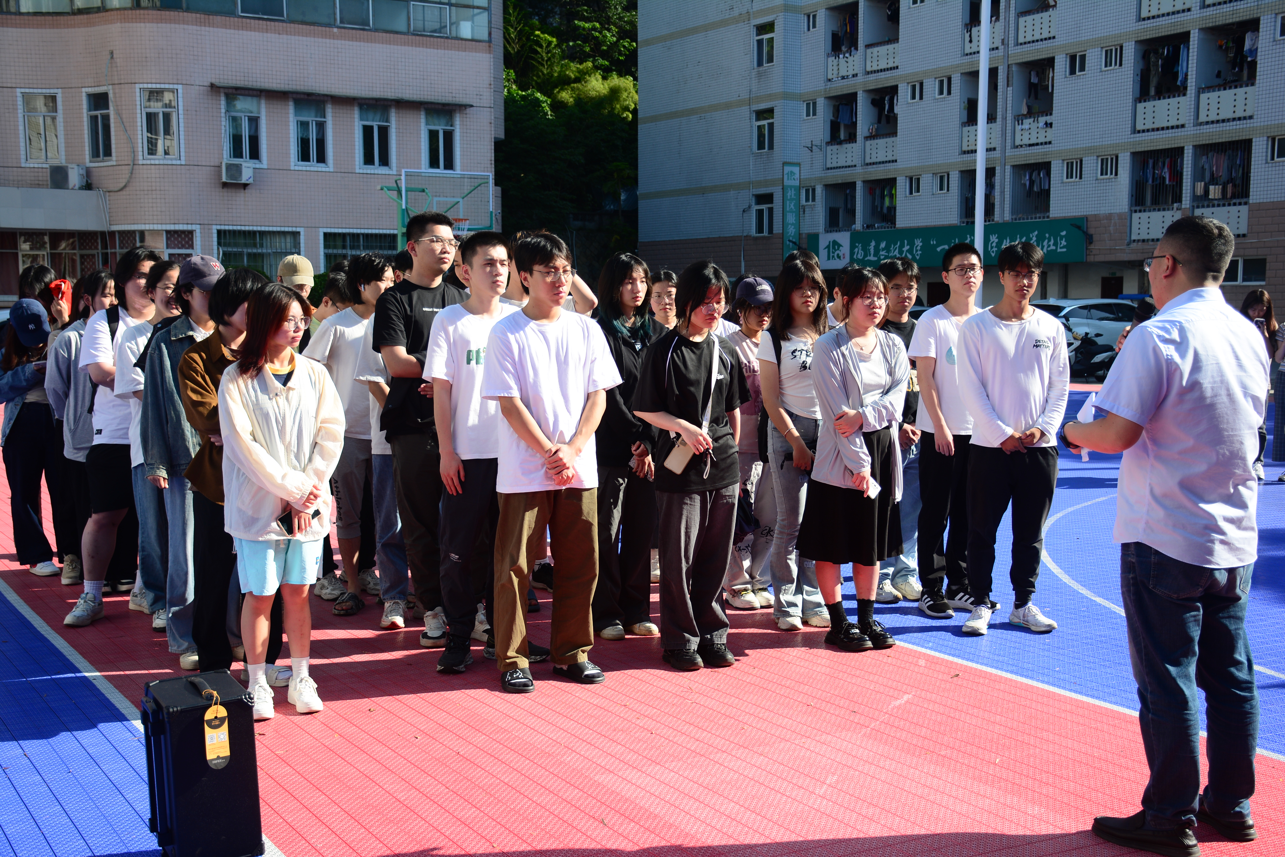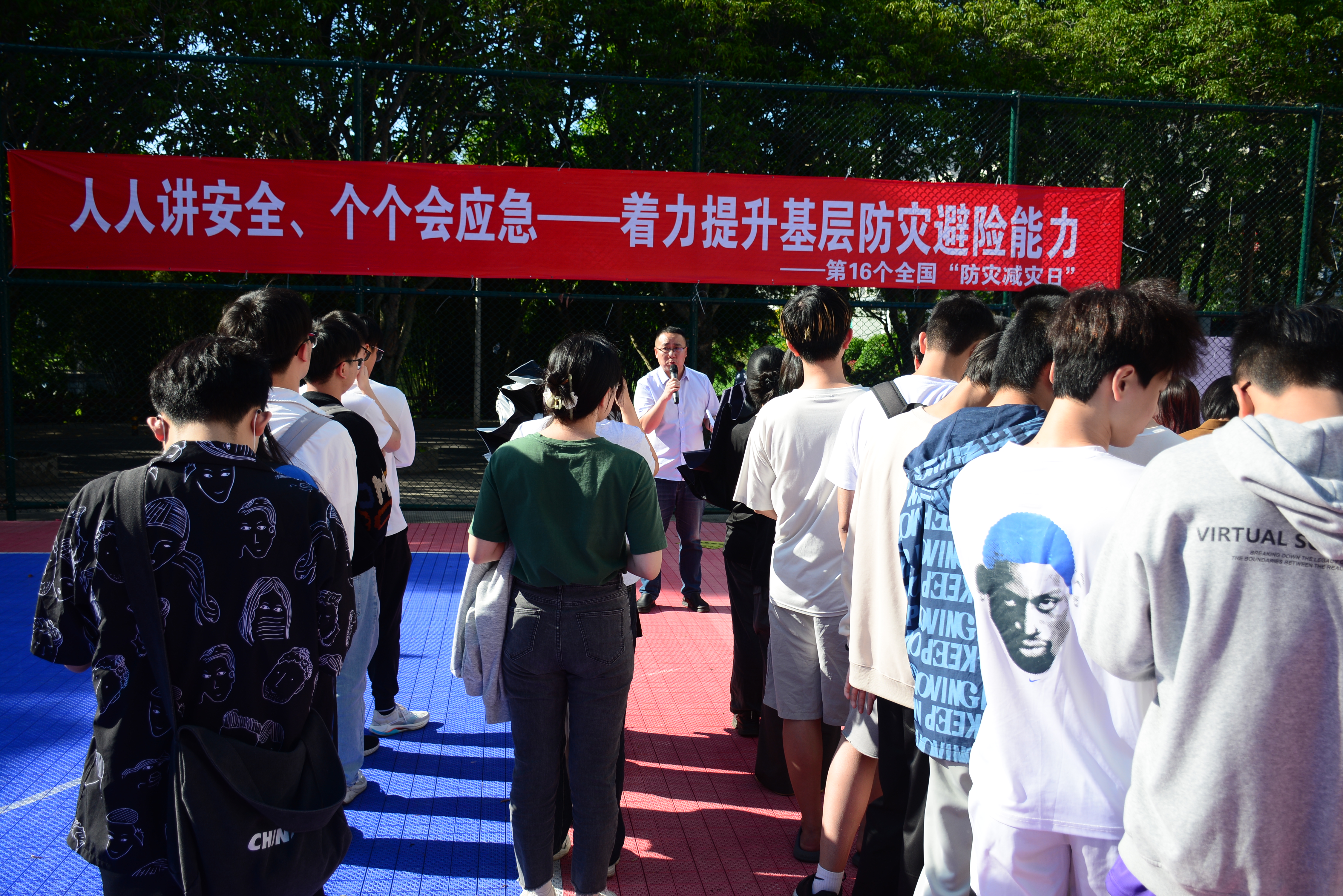 随着演练警报声响起,计算机与信息学院学生反应迅速,安全有序从宿舍楼进行撤离。在撤离过程中,同学们时刻保持冷静、听从指挥,迅速到达南区篮球场完成疏散。在应急疏散演习结束后,保卫处消防科徐清锋老师同在场同学围绕火灾预防、消防安全、应急逃生三个方面开展了消防安全培训。