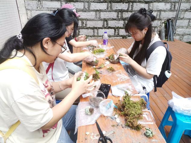 活动现场,同学们运用各式各样的苔藓,发挥想象力,制作微观小盆景,同时积极交流,互相欣赏,分享着各自的见解和乐趣。郑诚乐在活动过程中为同学们答疑解惑,科普园艺知识。同学们纷纷表示,在活动中学会了很多知识,心灵得到了安慰和治愈,舒缓了自身压力。
