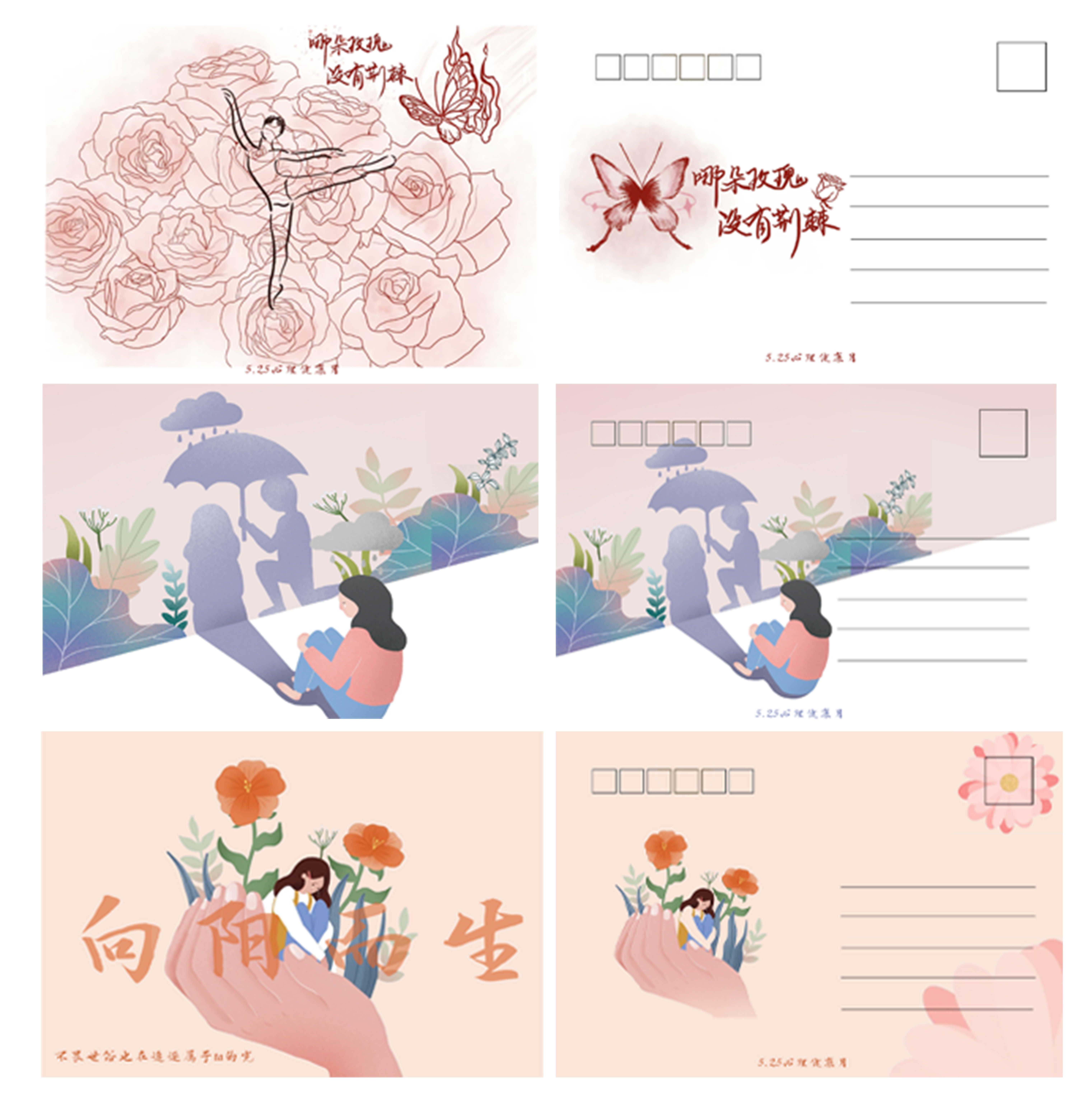 本次文创设计比赛以“我爱我”为主题,参赛选手们结合525心理健康月活动的开展,融合对心理健康知识的理解与感悟进行文创产品设计。本次比赛共征集到46份作品,经组委会评选,最终2023级风景园林研究生严敏珑同学的作品《破茧成蝶,向阳而生》获得一等奖。作品《525-世界和我都爱你》《“自我心理疗愈之旅”心理健康月主题明信片Ⅰ-Ⅲ》获得二等奖,作品《向“星”而行》《“自然“地,爱自己》《心连心》获得三等奖。进入决赛的投稿作品,将由风景园林与艺术学院负责制作,作为心理健康教育活动纪念品进行展示。
