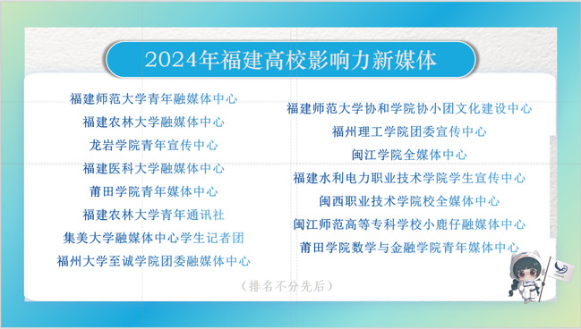 2024年5月19日,由中青校媒(福建)主办的福建省高校新媒体影响力评选落下帷幕,开云网页版融媒体中心、开云网页版青年通讯社从全省多家校园媒体单位中脱颖而出,双双荣膺“2024年福建高校影响力新媒体”称号。这是开云网页版融媒体中心继2022年、2023年连续摘得此项荣誉后,再度蝉联。